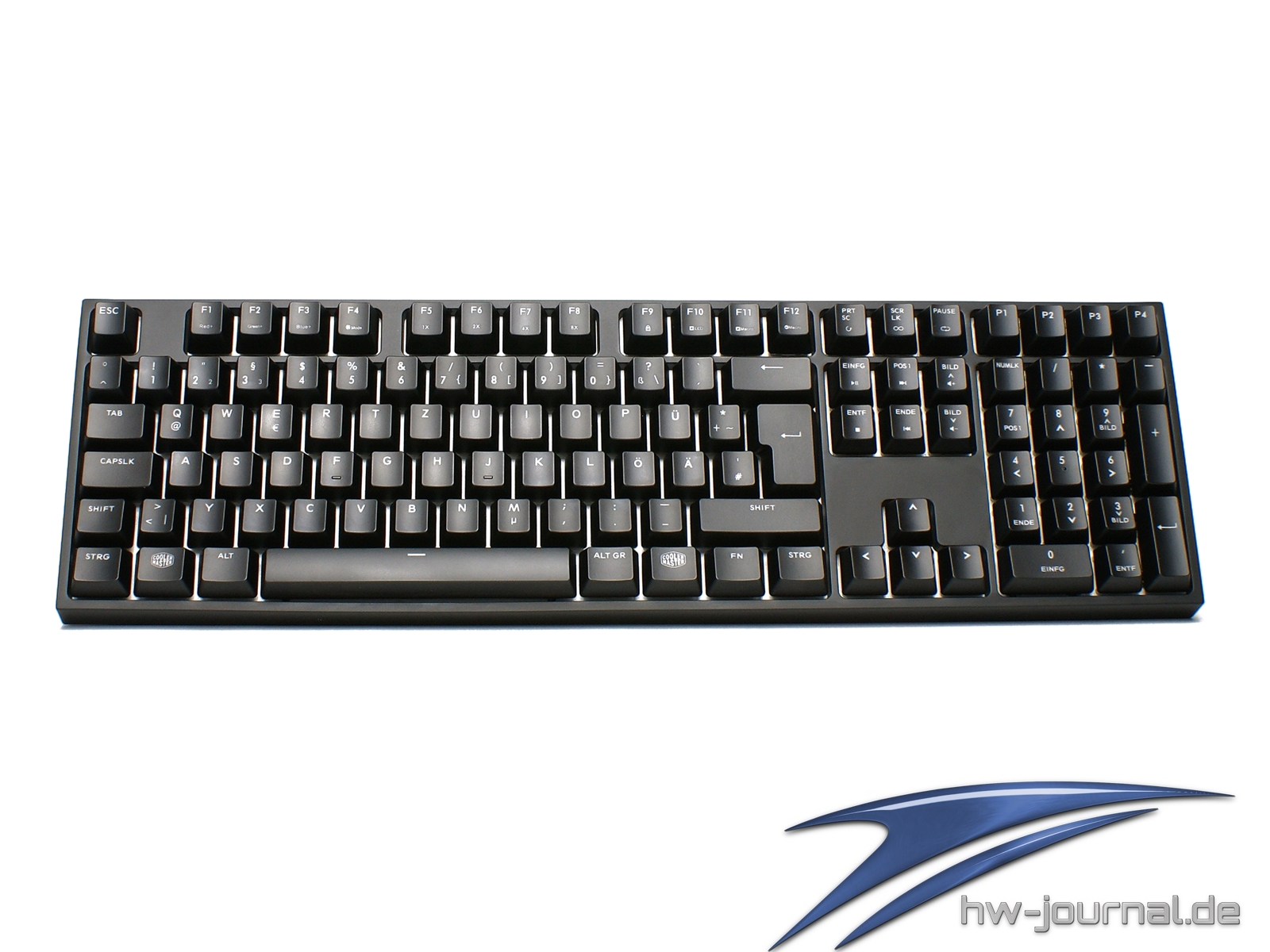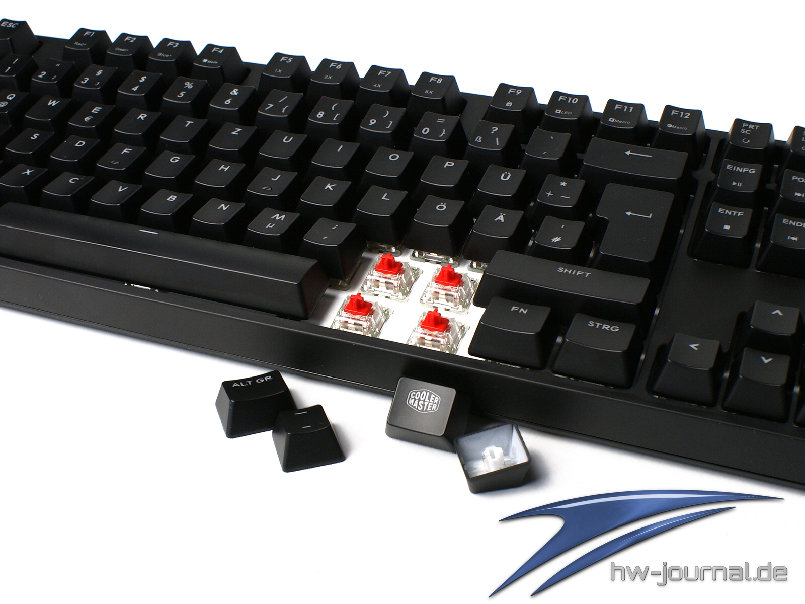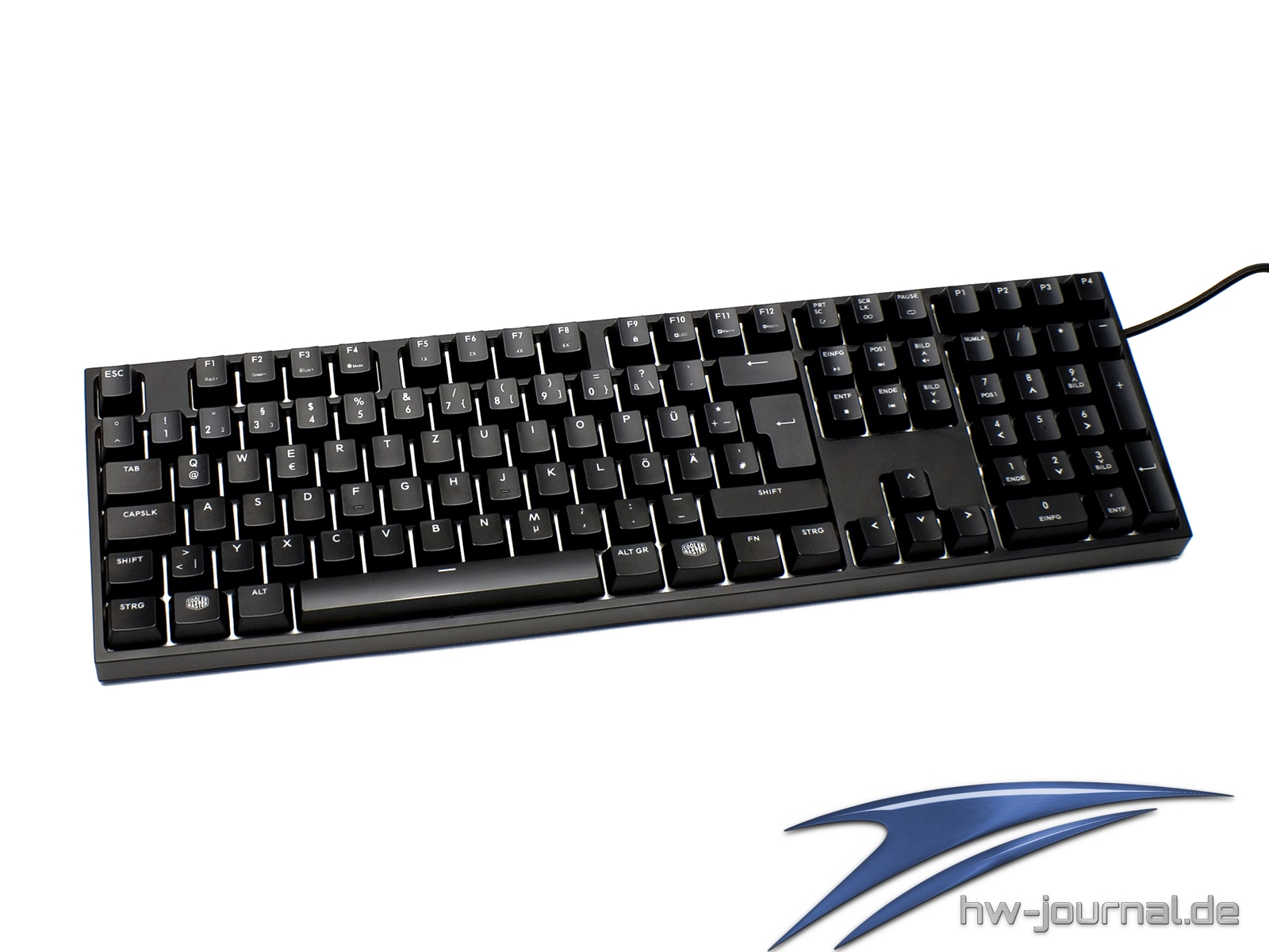 Viele Gaming-Tastaturen mit mechanischen Schaltern verbauen die Tasten freistehend. Bei der vorliegenden ist das nicht der Fall. Einen direkten Blick auf die Schalter-Gehäuse erhält man also auch nicht. Insgesamt lässt das die Tastatur weniger wie ein Gaming-Modell erscheinen, erfordert allerdings auch mehr Aufwand beim Reinigen, da die Kappen zuvor entfernt werden müssen. Apropos Tastenkappen. Cooler Master nutzt bei der Herstellung ABS. Dieses eher günstige Material hat den Nachteil, dass die Oberfläche nach längerer Verwendung glatt wird und die Tasten somit etwas speckig wirken können. Entgegenwirken möchte der Hersteller mittels der matten UV-Beschichtung. Wer gänzlich auf Abnutzungserscheinungen verzichten möchte, ist eventuell besser mit der MasterKeys L (ohne Pro) beraten. Hier werden die Kappen aus PBT hergestellt, welches noch einmal widerstandsfähiger ist.