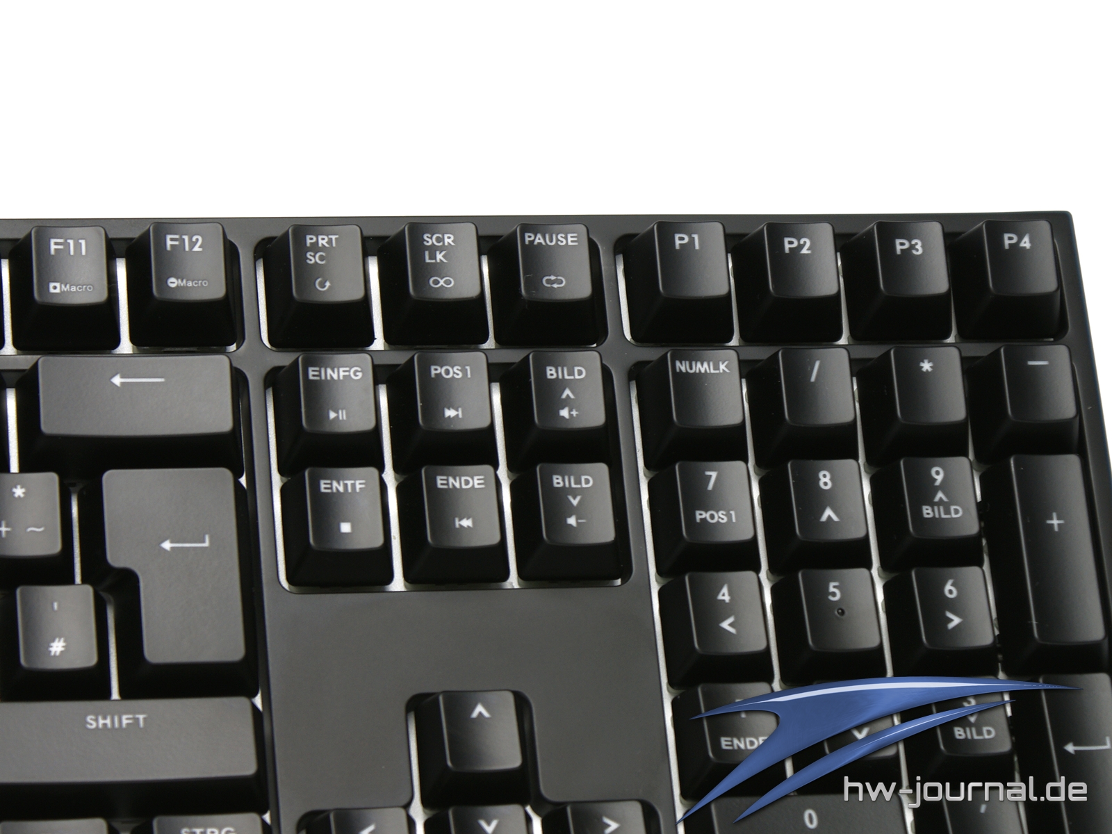 Wie bereits angesprochen, handelt es sich bei der Pro L um eine Full Size Tastatur. Zu den üblichen 105 Tasten gesellen sich vier weitere, auf welche die Profile abgelegt werden. Trotz Full Size-Formats fällt sie jedoch eher klein aus. Wie zu erkennen liegt das am schmalen Rahmen. Durch diesen fällt auch die sonst übliche, zusätzliche Statusanzeige von Caps-, Num- und Scroll-Lock weg. Bei der MasterKeys Pro S ist dies ebenfalls der Fall. Bei diesen beiden Modellen wird der Status einfach über die LED unter der jeweiligen Taste angezeigt. Das heißt, ist die Funktion deaktiviert, bleibt die jeweilige Taste unbeleuchtet. Diese eigentlich clevere Lösung kann dann nachteilig sein, wenn man Beleuchtungs-Modi mit Bewegung wählt. Hier fällt es dann manchmal schwer zu sehen, ob die einzelnen Tasten nun aktiv sind oder nicht. Die Pro M verfügt im Übrigen über die „klassische“ Anzeige.