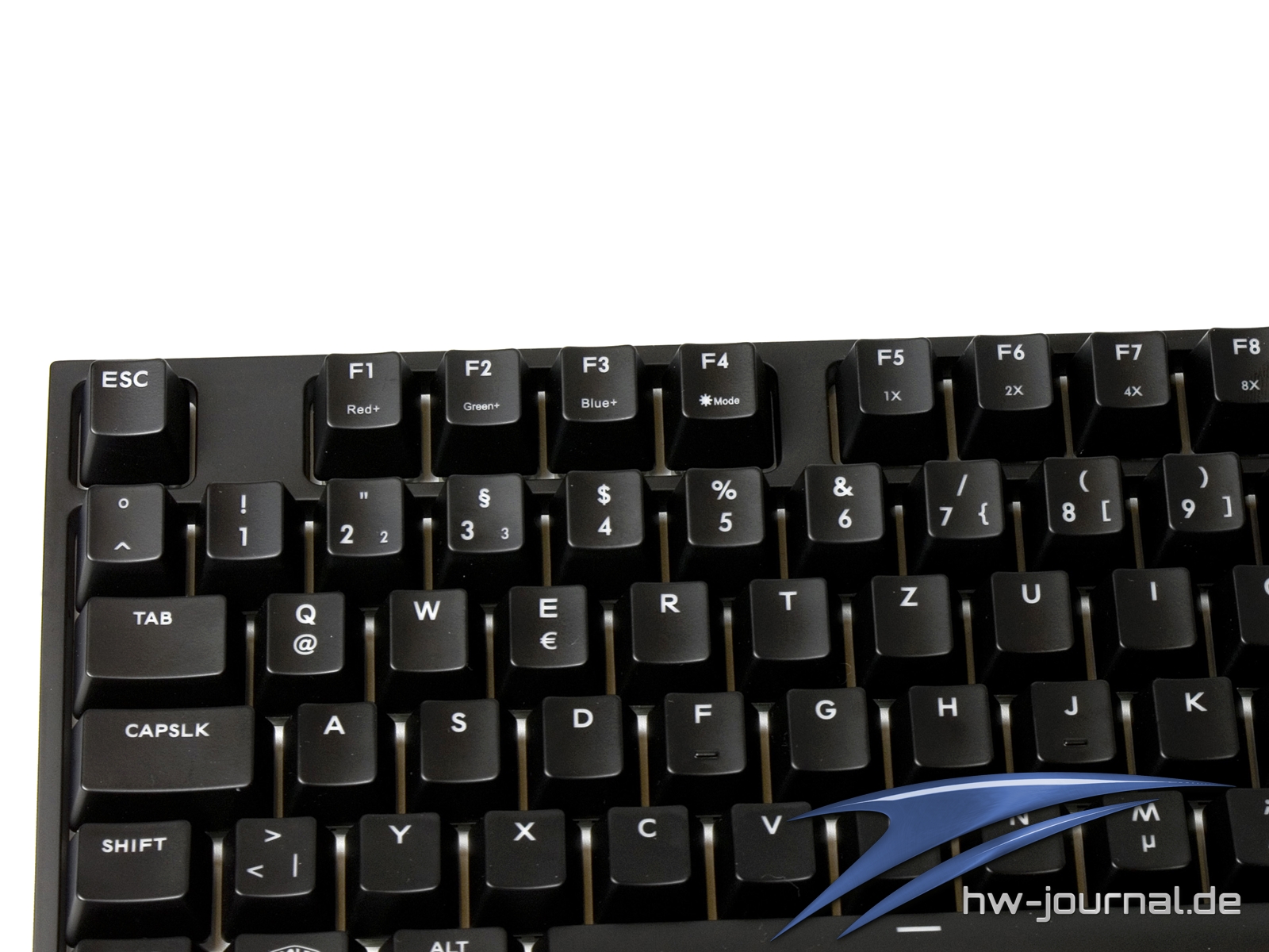 Man kann seine Einstellung aber auch zu jeder Zeit ohne Software treffen. Dabei kommt wieder die FN-Taste zum Einsatz. Des Weiteren ist die jeweils zweite Belegung der Tasten F1 - 4 nötig. Hier stellt man den Modus ein und mischt die Farbe. Genau, richtig gelesen. Wie eigentlich bei allen RGB LEDs wird jede Farbdarstellung gemischt. Bei der MasterKeys Pro hat man pro Farbe (rot, grün, blau) zehn Stufen und kann somit theoretisch 103 = 1000 verschiedene Farbtöne finden. Mit etwas Übung ist die Bedienung auch hier nicht sonderlich schwer.