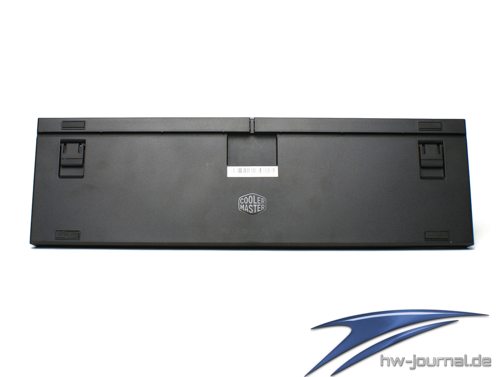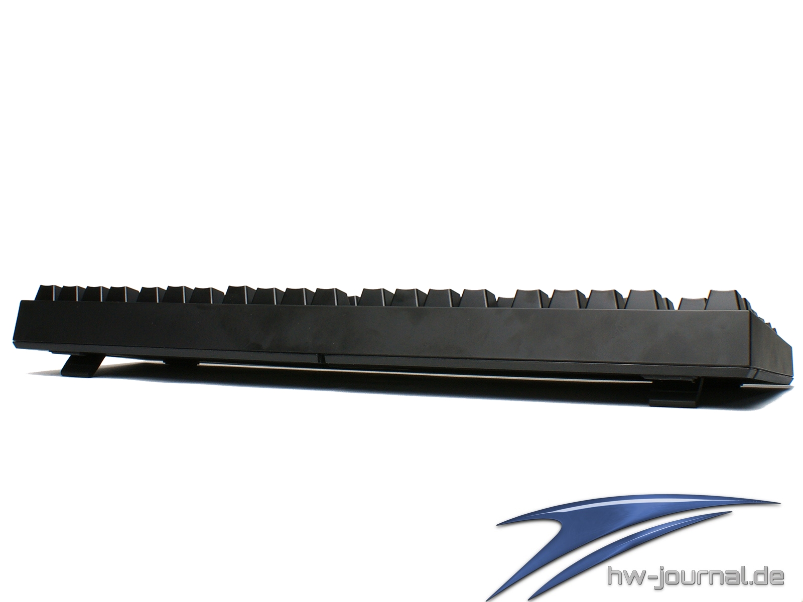Damit man auch in schnellen Spielsituationen die volle Kontrolle behält, ist die Tastatur mit vier Gummi-Stoppern versehen. Auch die Aufsteller haben eine Gummi-Fläche, allerdings wirkt diese etwas härter und weniger rutschfest. Was sich zusätzlich auf die Standfestigkeit auswirkt, ist die zur Stabilisierung des PCBs vorgesehene Metallplatte. Dadurch erhöht sich das Gewicht erheblich gegenüber Rubberdome-Tastaturen. Das USB-Kabel ist abnehmbar und wird mittig unter der Tastatur eingesteckt. Damit es nicht versehentlich gezogen wird, wird es durch einen Kanal etwas eingeklemmt. Diese Klemm-Kanäle verlaufe nicht nur gerade nach hinten, sondern auch waagerecht. Somit könnte man das Kabel auch seitlich aus der Tastatur führen.