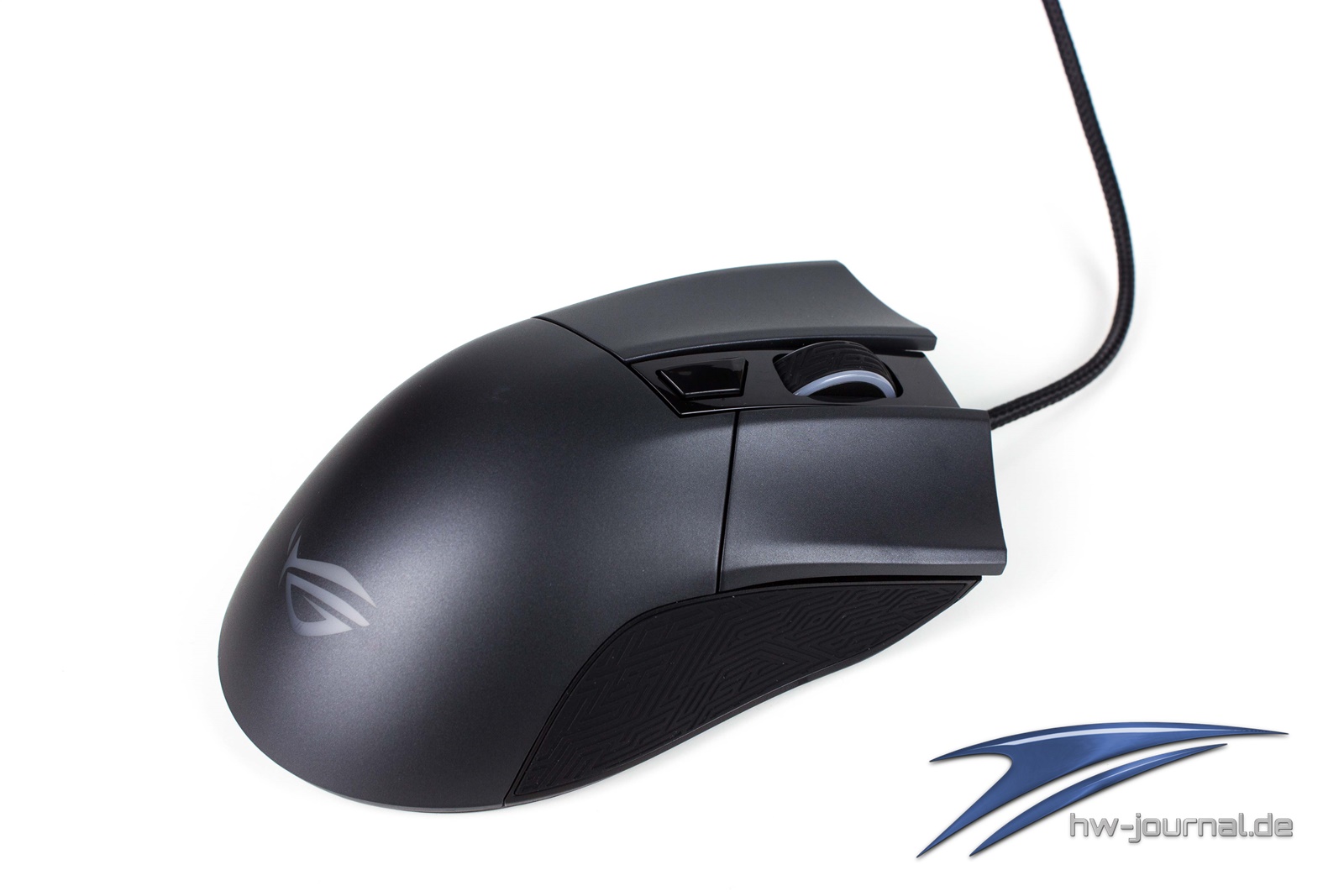 Die Seiten sind weiterhin mit zwei Gummipads und ihrem speziellen ASUS ROG Design bestückt. Als Neuheit findet sich hierbei auf der linken Seite eine neue Taste, die man mitten in das Gummipad gesetzt hat. Sie ist ähnlich wie der Sniper-Button bei der Corsair Gaming M65 Pro RGB und verringert bei gedrücktem Betätigen die DPI-Stufe. So kann man bei Bedarf für etwas mehr Präzision sorgen.