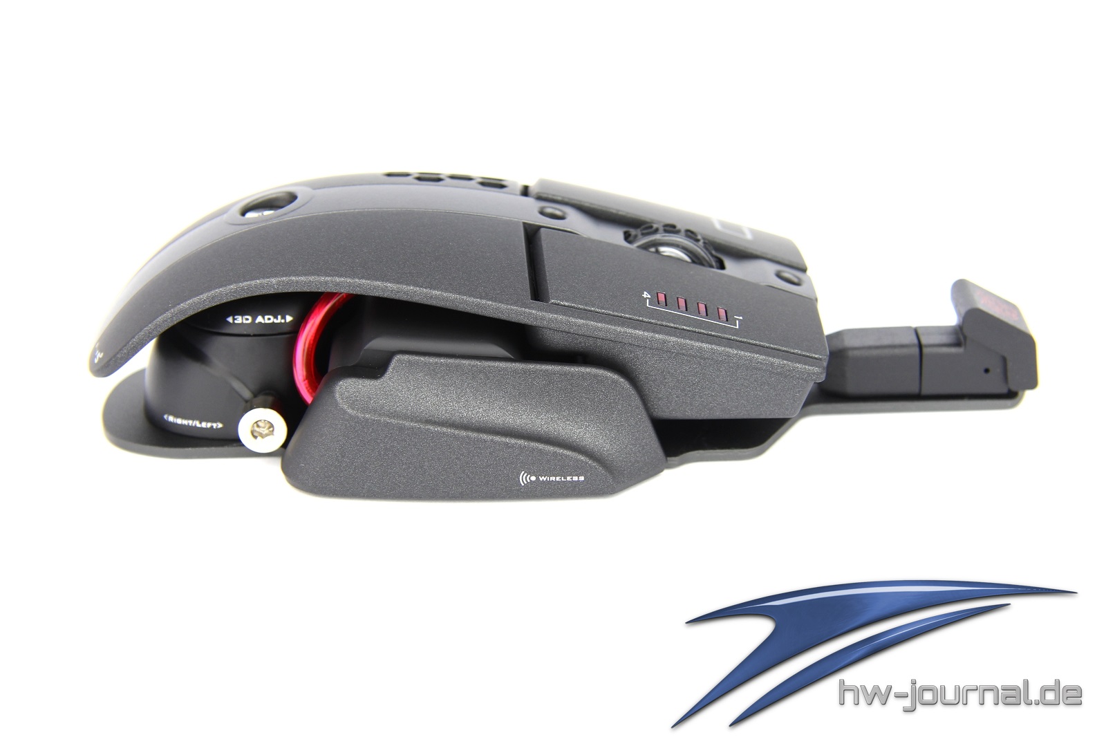 Das Design ist einzigartig, unterscheidet sich jedoch vom Vorgänger kaum. Es wurden dunklere Farben verwendet und einige optische Details wurden hervorgehoben. Hier sieht man deutlich die Stellschraube, die die Höhe der Handballenauflage der Maus beeinflusst. Der Herstellr nennt diese Feature 3D Adjustment und ist insgesamt nichts neues bei den Nagern. Der Hersteller Mad Catz produzierte schon vor langer Zeit sehr individuell einstellbare Mäuse - schön, dass sich auch mal ein anderer Hersteller an einem solchen Prinzip versucht.