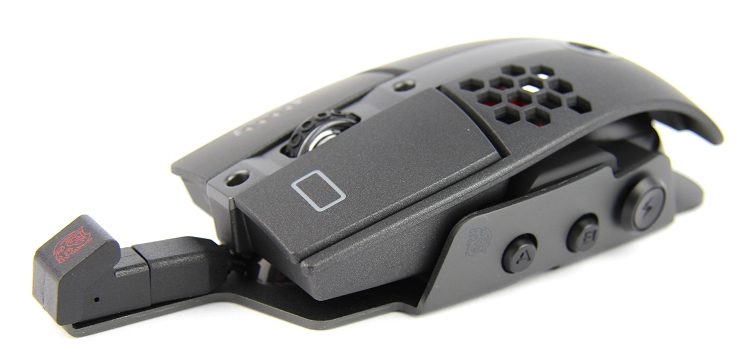 Auf der Oberseite wird die Stellschraube für die Höhe der Handballenauflage ersichtlich. Die beiden Schrauben beim Mausrad sind ohne Funktion und halten lediglich das Konstrukt zusammen. Unterhalb des Durchlasses ist das Logo der Tt eSPORTS Marke zu sehen. Zudem zeigen die Primärtasten LED's auf, die z.B. das aktuelle Profil oder die gewählte DPI Rate anzeigen. Das eher schmale Mausrad ist ebenfalls beleuchtet, hat jedoch etwas spiel. Die Unterseite zeigt die vielen Auflageflächen der Maus. Hier erkennen auch Laien, dass sich Tt eSPORTS hier besser auf zwei große Flächen statt vielen kleinen hätten setzen sollen. So hätte man auch die Auflage der Kabelhalterung etwas nach oben biegen können, sodass das zusätzliche Gelitpad hätte erspart bleiben können - weniger Widerstand lässt die Maus besser gleiten. Was uns sehr geärgert hat sind die teilweise schief aufgeklebten Hinweise unter der Maus. So ist der obere Hinweis um ein paar Millimeter verschoben, was sich im schlimmsten Fall auf das Gleitverhalten der Maus auswirkt.