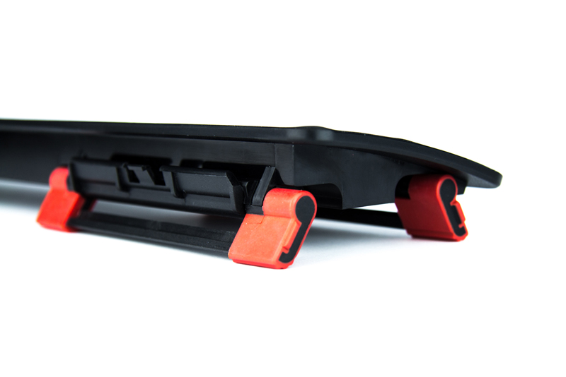 Die Handballenauflage ist auf der Oberseite gummiert und es befindet sich ein eingeprägtes Logo auf der rechten Seite. Die vorhandenen Clips an jeder Seite rasten problemlos und mit einem hörbaren Klick in die Tastatur ein. Die rot gummierten Gummifüße lassen sich jeweils in zwei Positionen stellen. Dadurch, dass insgesamt 3 Füße an jeder Seite (inklusive Tastatur) vorhanden sind, kann die Ergonomie optimal angepasst werden.