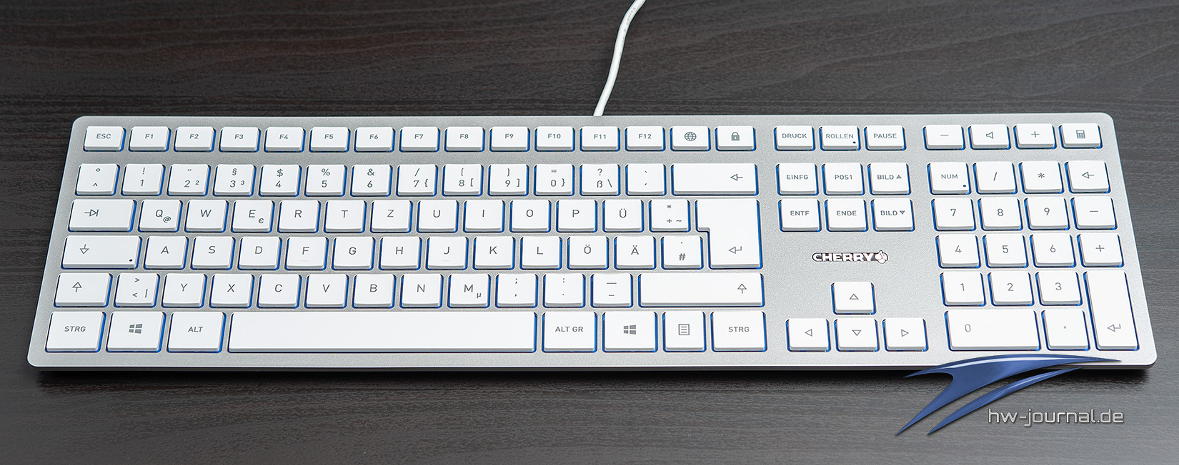 Bei der Tastentechnologie stzt Cherry nicht auf ihre neuen Cherry MX Low Profile RGB Taster, sondern auf die hauseigene SX-Technologie. Dabei handelt es sich um die Scherenmechanik, welche ein sehr gutes Schreibgefühl garantieren soll. Der Hersteller traut dieser Technik um die 10 Millionen Betätigungen zu was gleichzeitig die Langlebigkeit untermauern soll. Beim Layout bleibt man sich dem Standard treu, bis auf sechs zusätzliche Tasten, bietet die Tastatur die übliche Ausstattung. Die erwähnten Zusatztasten dienen der Lautstärkeregelung, der Stummschaltung, Schnellaufruf des Rechners oder Browsers und zum schnellen Sperren des PCs. Andere Funktionen kann man nicht hinterlegen, da man keine Software mitliefert.