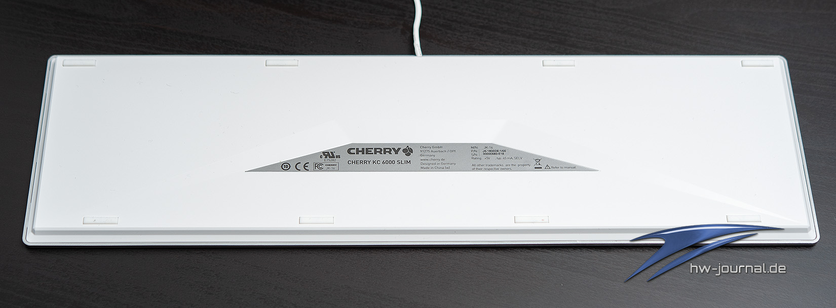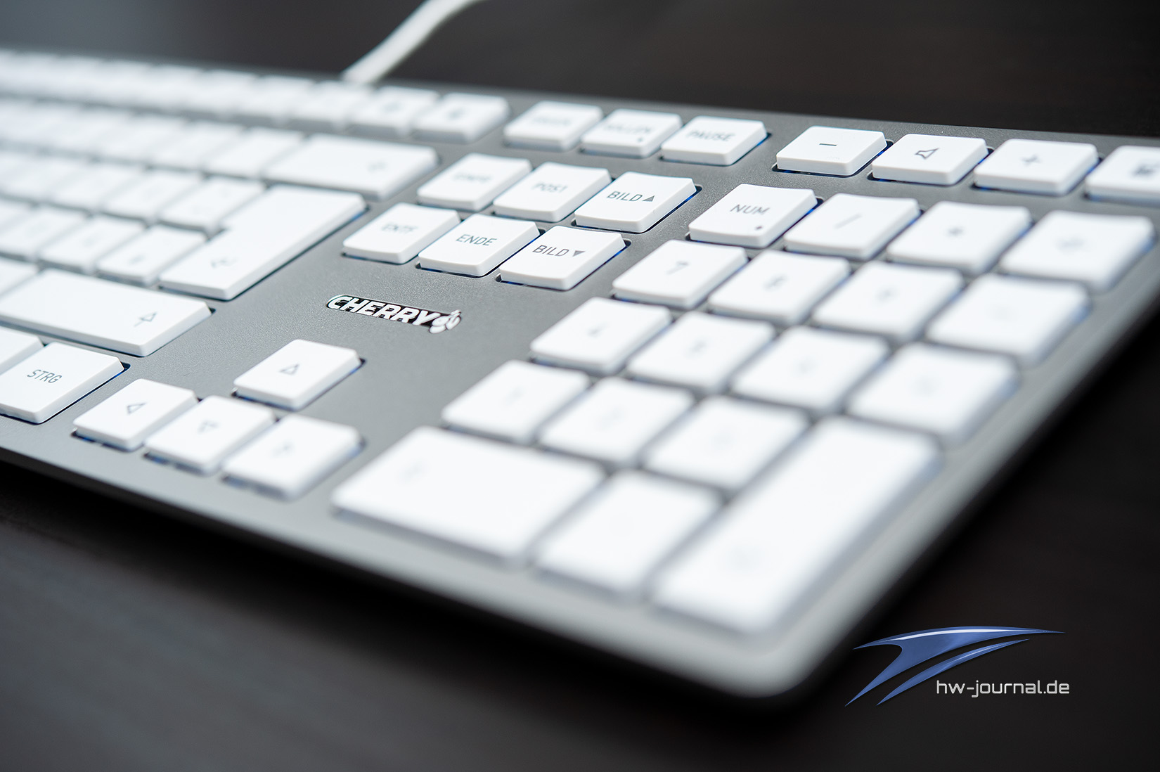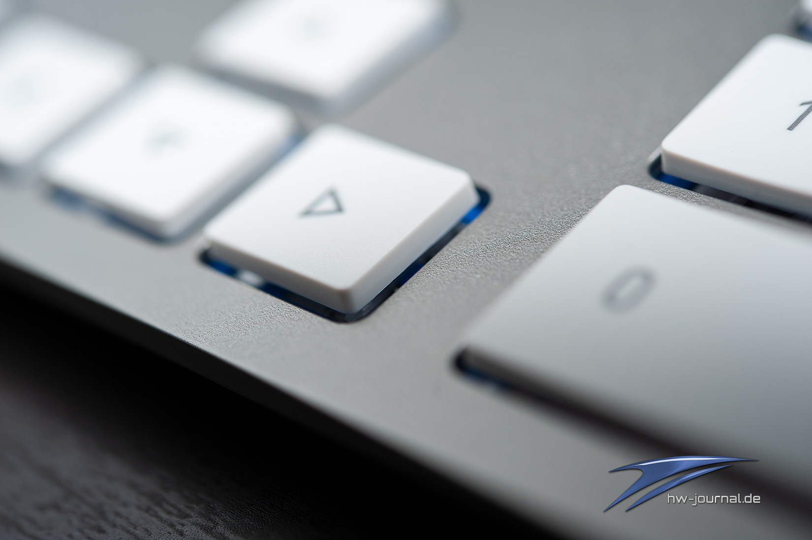 Die Tasten selbst sind mit einem Laser beschriftet worden und sitzen auf einer stabilen Metallplatte, die sich unter der grauen Kunststoffabdeckung befindet. Dieses Element aus Metall verleiht dem Gehäuse eine gute Steifigkeit und lässt das Eingabegerät stabil auf dem Schreibtisch stehen.