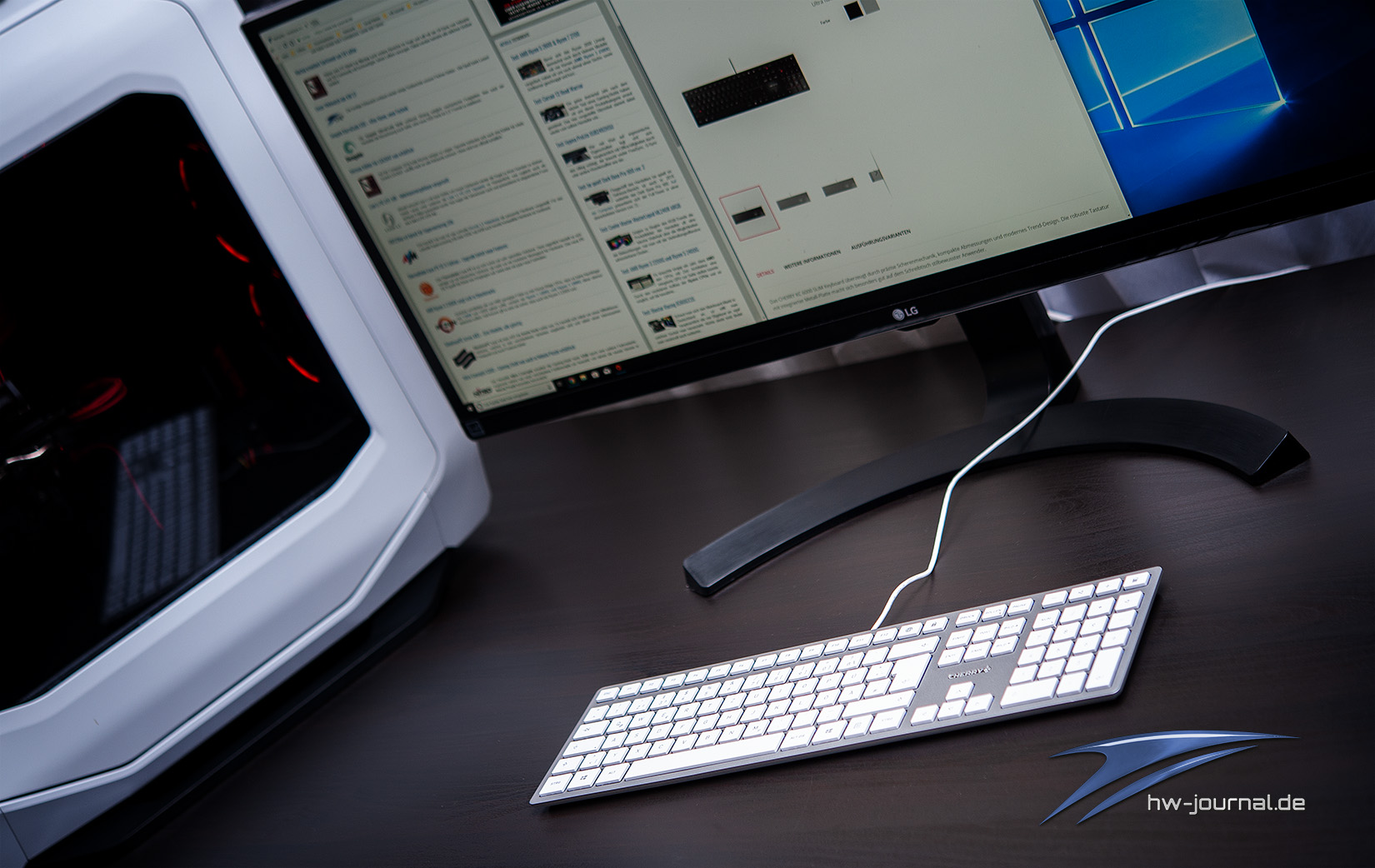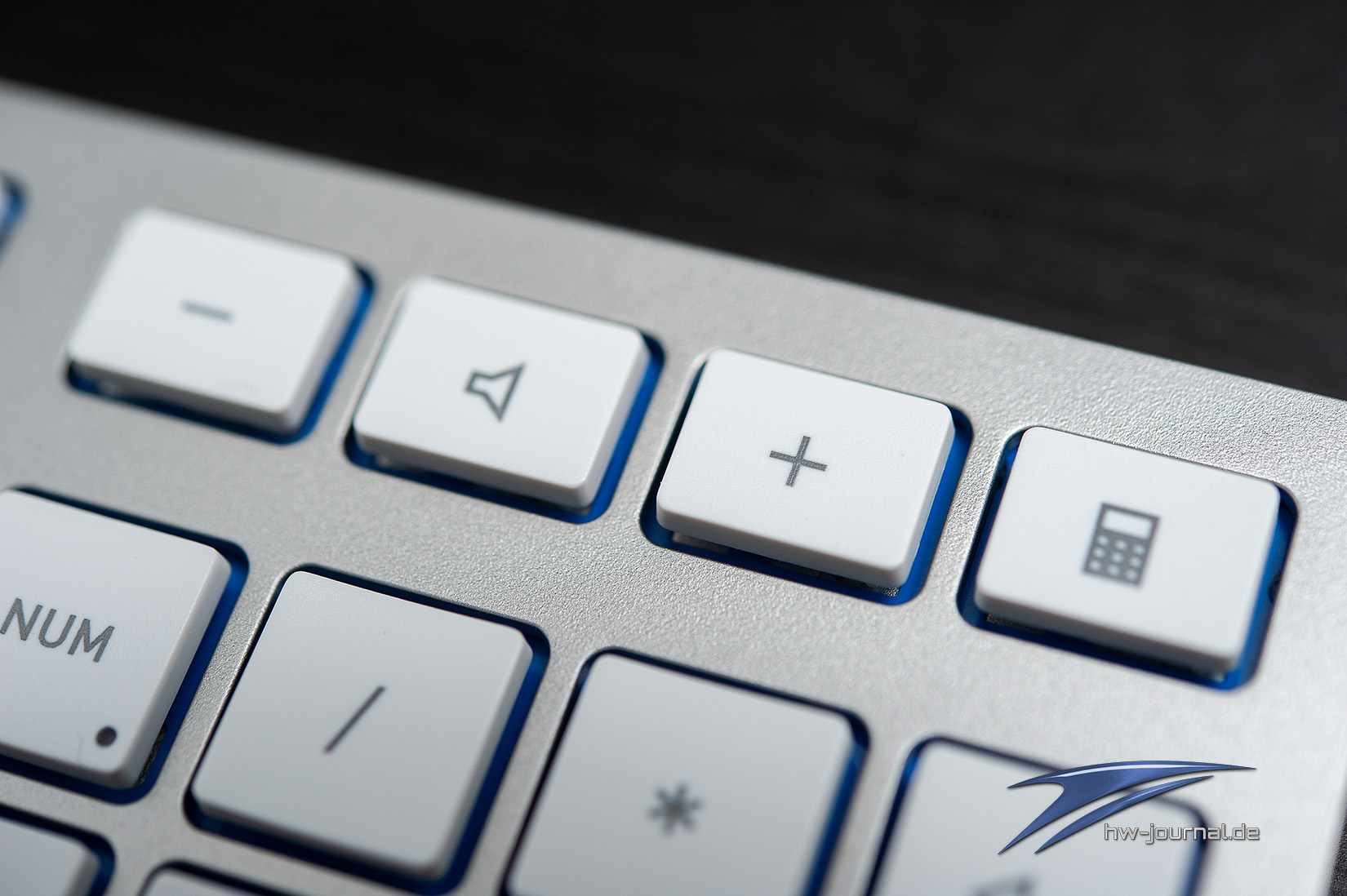 Wir empfanden die Höhe und die Form der Tastatur im täglichen Umgang als sehr angenehm und deutlich besser als übliche OEM-Produkte die den Bürorechnern meistens beiliegen. Dazu fällt die akustische Belästigung der Kollegen deutlich geringer aus, als bei OEM-Derivaten oder mechanischen Vertretern. Denn das eigentliche Tastengeräusch ist sehr leise, überhaupt nicht störend im Alltag und somit perfekt fürs Büro geeignet.