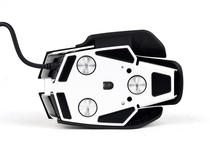 Die Unterseite zeigt sich bekannt. Drei große Schrauben sind hier dominant. Darunter verbergen sich kleine Scheibengewichte (je 6g). Ein Werkzeug zum Öffnen liegt nicht bei, man kann sich hier aber einer kleinen Münze bedienen. Während die vorderen Gewichte leicht zu entfernen waren, klemmte das hintere fest und war nur mit Gewalt zu entfernen. Unscheinbar verbirgt sich der PixArt PMW3391 aktuell das Flaggschiff des Herstellers ist und eine besonders hohe Leistung verspricht. Ob er diese bestätigen kann, klärt u. a. die folgenden Seite