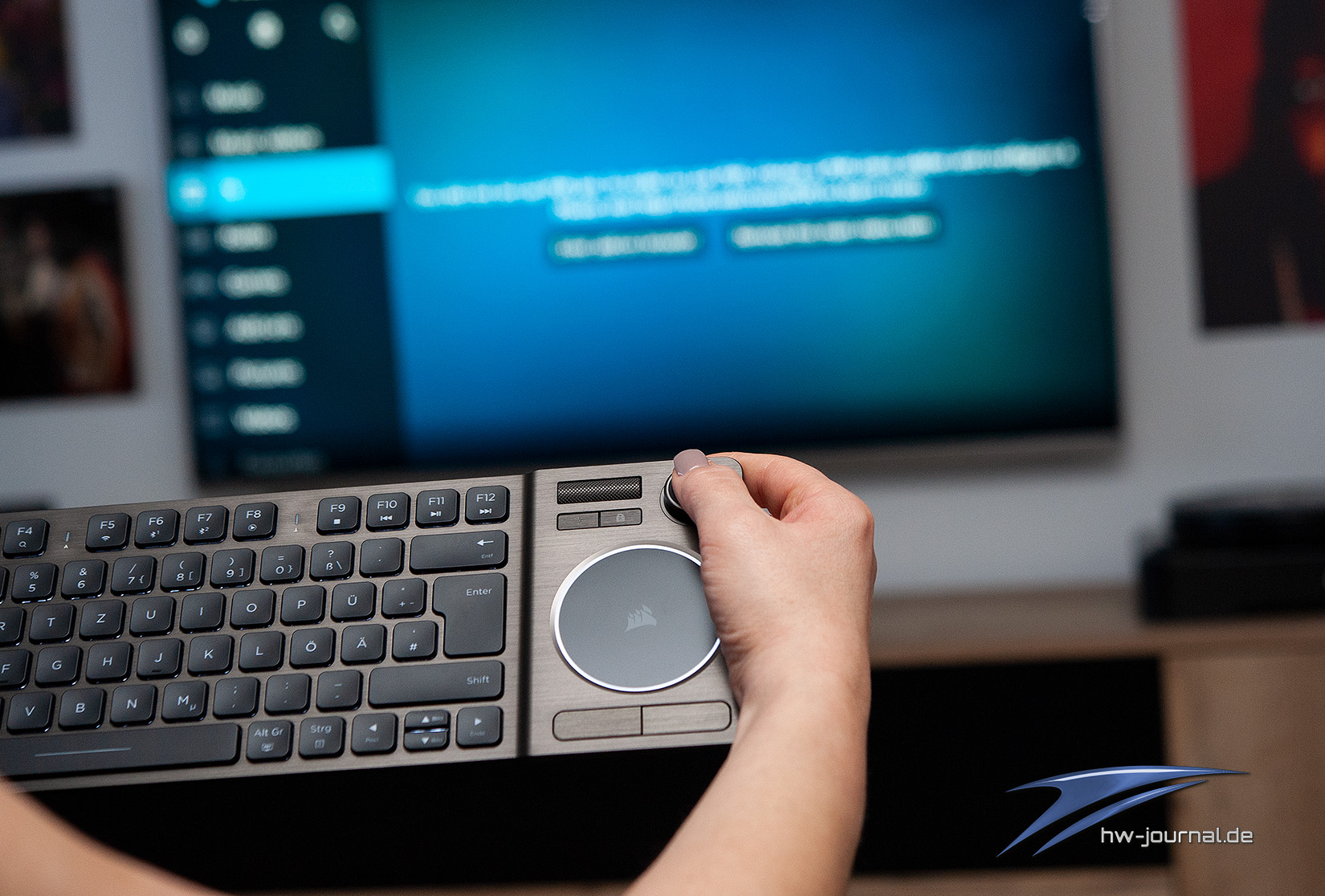 Aber eine Multimedia-Tastatur soll auch nicht diesen Bereich bedienen, dafür gibt es genügend andere kabellose Peripherie. Sondern die Aufgabe besteht in einer Steuerung eines Mediagerätes, das am besten kabellos mit vielen Funktionen. Und genau das ist die Stärke der Corsair K83 Wireless. Dank der vielen doppelt belegten bzw. konfigurierbaren Tasten, der Vier-Finger-Gestensteuerung unter Windows 10 ist die K83 ein echtes Multitalent und lässt im Umgang eines HTPCs nichts vermissen. Die Multimedia-Tasten inklusive Volumenregler mit Mute-Funktion steuern jede erdenkliche Musiksoftware, die Schnellwahltasten wie Browser, Suche, Media Player etc. helfen im täglichen Umgang und können mit der iCUE-Software auch nach Belieben angepasst werden.