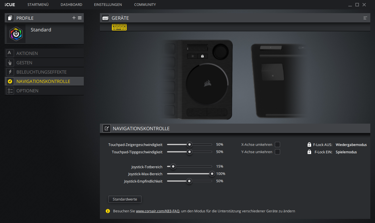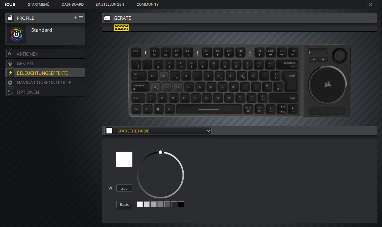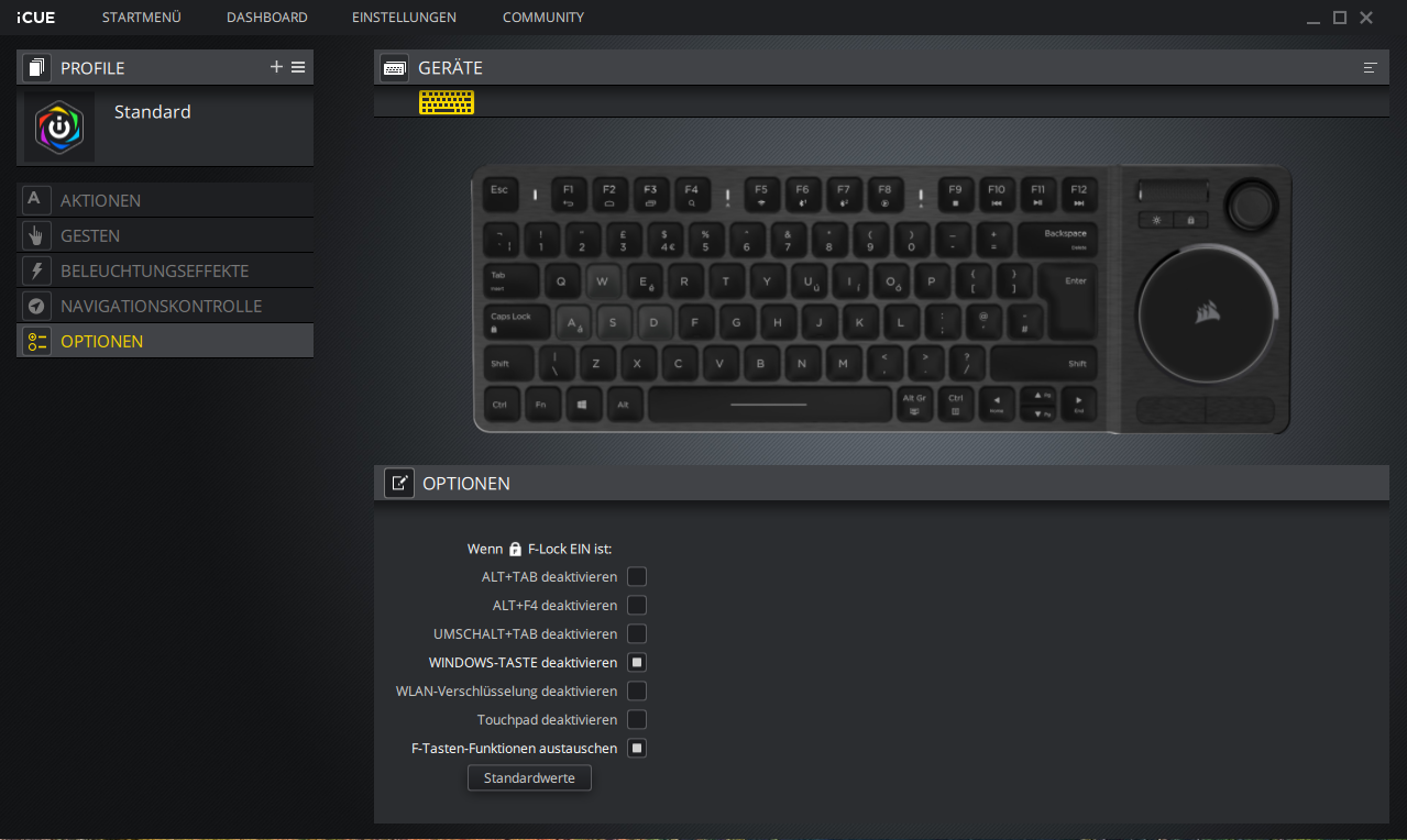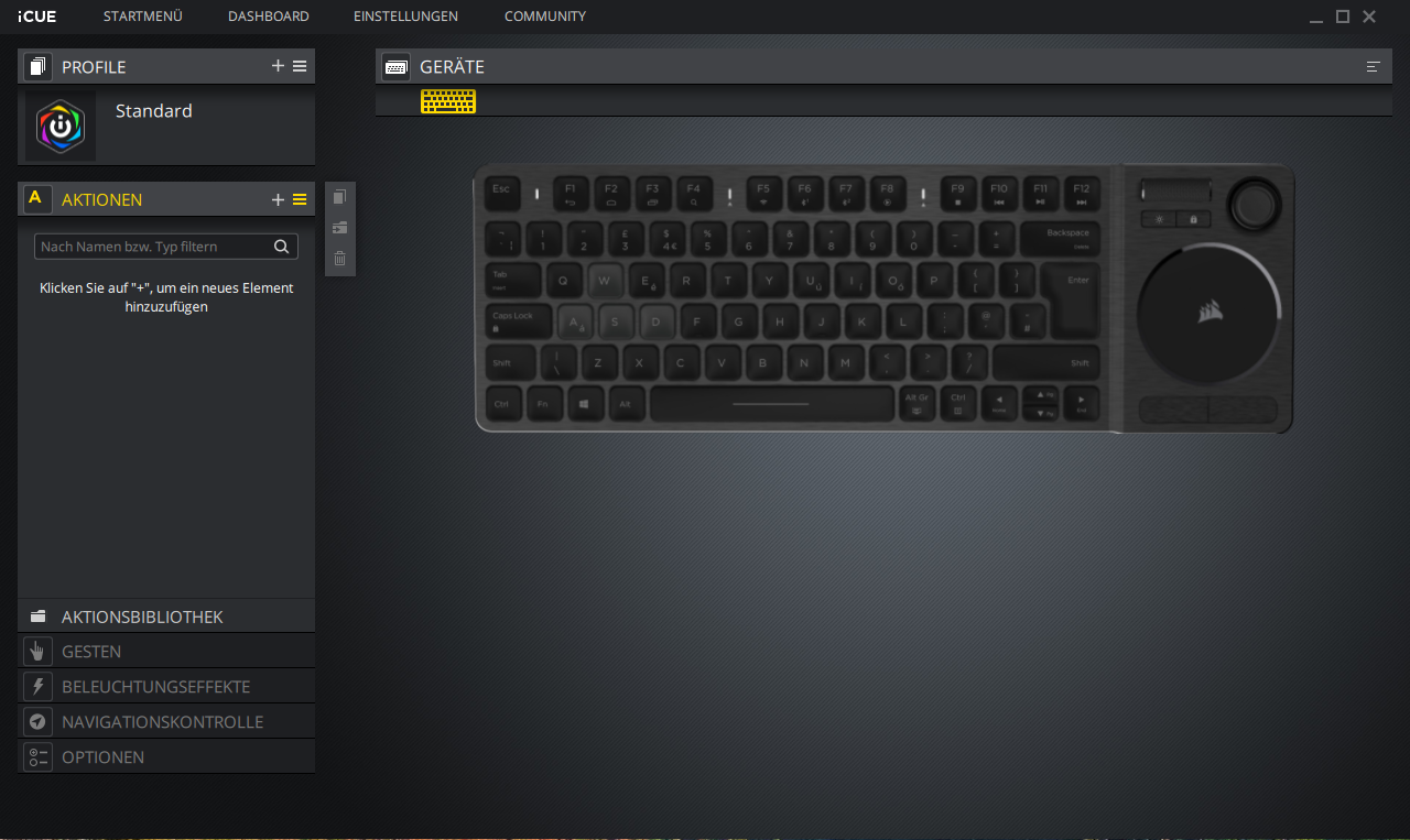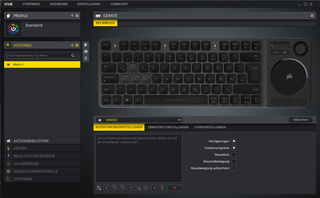 Wie man es von Corsair gewohnt ist, kann auch die K83 Wireless-Tastatur über die Herstellersoftware iCUE konfiguriert werden. Hier geht es aber nicht um RGB-Effekte oder andere Spielereihen, sondern die Software ermöglicht es dem Nutzer alle Gesten, Tastenbelegungen und Makros sich seinen persönlichen Vorlieben anzupassen.