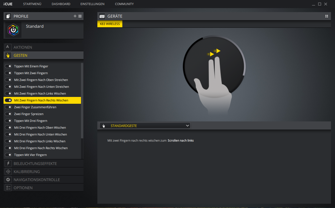 Die Software ist dabei ein starker Partner, bietet eine wirklich gute Struktur bzw. Übersicht und ermöglicht einen einfachen Zugang zu den einzelnen Konfigurationen. Wer die Geststeuerung über die iCUE-Software von Corsair regeln möchte, muss unter den Geräteeinstellungen einen Haken bei „Gestenanpassung aktivieren“ setzen, erst dann können die einzelnen Gesten über die Software angepasst werden.