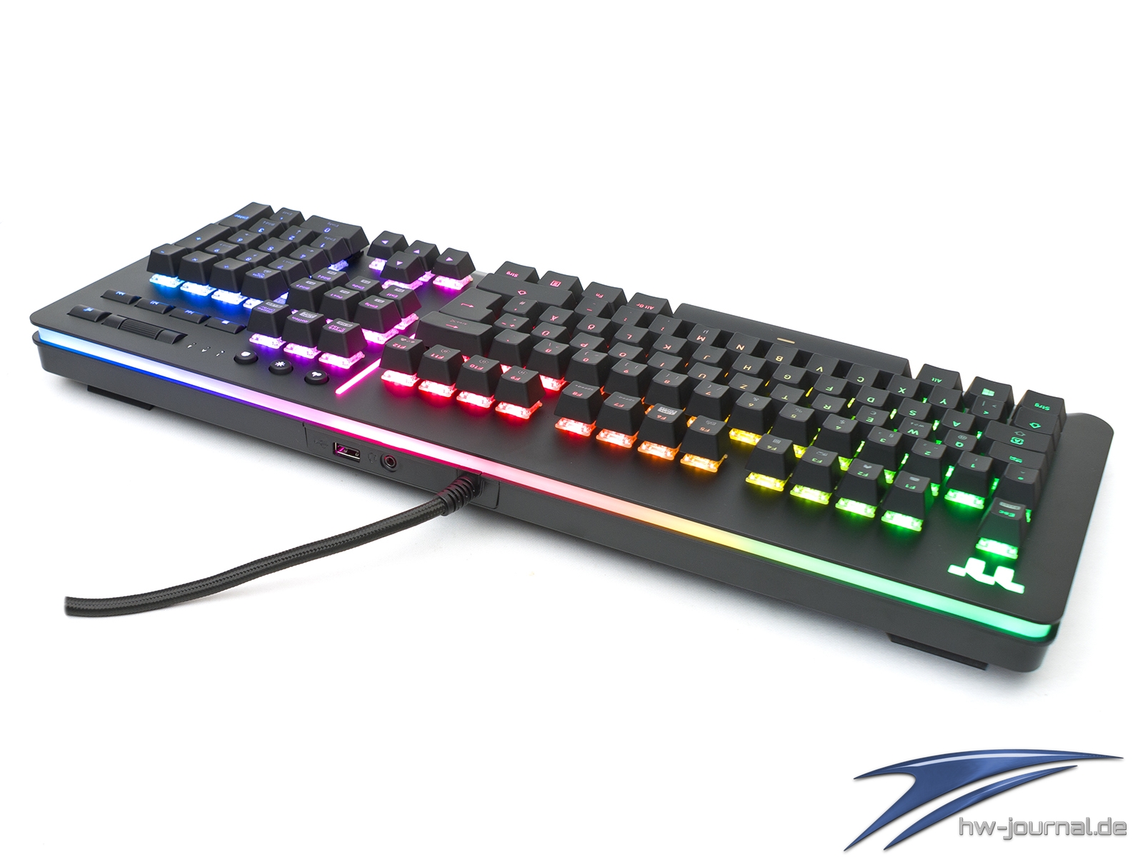 Die coole Optik wirkt sich allerdings etwas negativ auf die Ergonomie aus. Durch die hohe seitliche RGB-Zonen, baut die Tastatur recht hoch auf, was sich aufgrund des Fehlens einer Handballenauflage störend auswirkt. Helfen kann hierbei auch die zweistufige Verstellung nicht, auch wenn das Problem zumindest etwas geschmälert wird. Eine Revision mit den neuen Cherry MX Low Profile könnte hier eventuell zusätzlich entgegenwirken. Was die Nutzung angeht, erzeugen auch die on-the-fly Befehle etwas Kopfschmerzen. Denn weder die beiliegende Anleitung, noch die Produktseite erklären wie man bspw. die Beleuchtung im Detail steuert oder Macros aufnehmen kann. Das ermöglicht erst die Software, die sich bei den Einstellungen als große Hilfe herausstellt und kaum Wünsche offen lässt. Ärgerlich ist, dass man die beiden Anschlüsse auf der Rückseite inkonsequent umgesetzt hat. Der USB-Anschluss ist bei seinem Datendurchsatz sehr langsam unterwegs und der 4-polige Headset-Anschluss kommt ohne Adapter und direkt am Mainboard angeschlossen, kann man ihn damit nur als Kopfhörer-Ausgang nutzen.