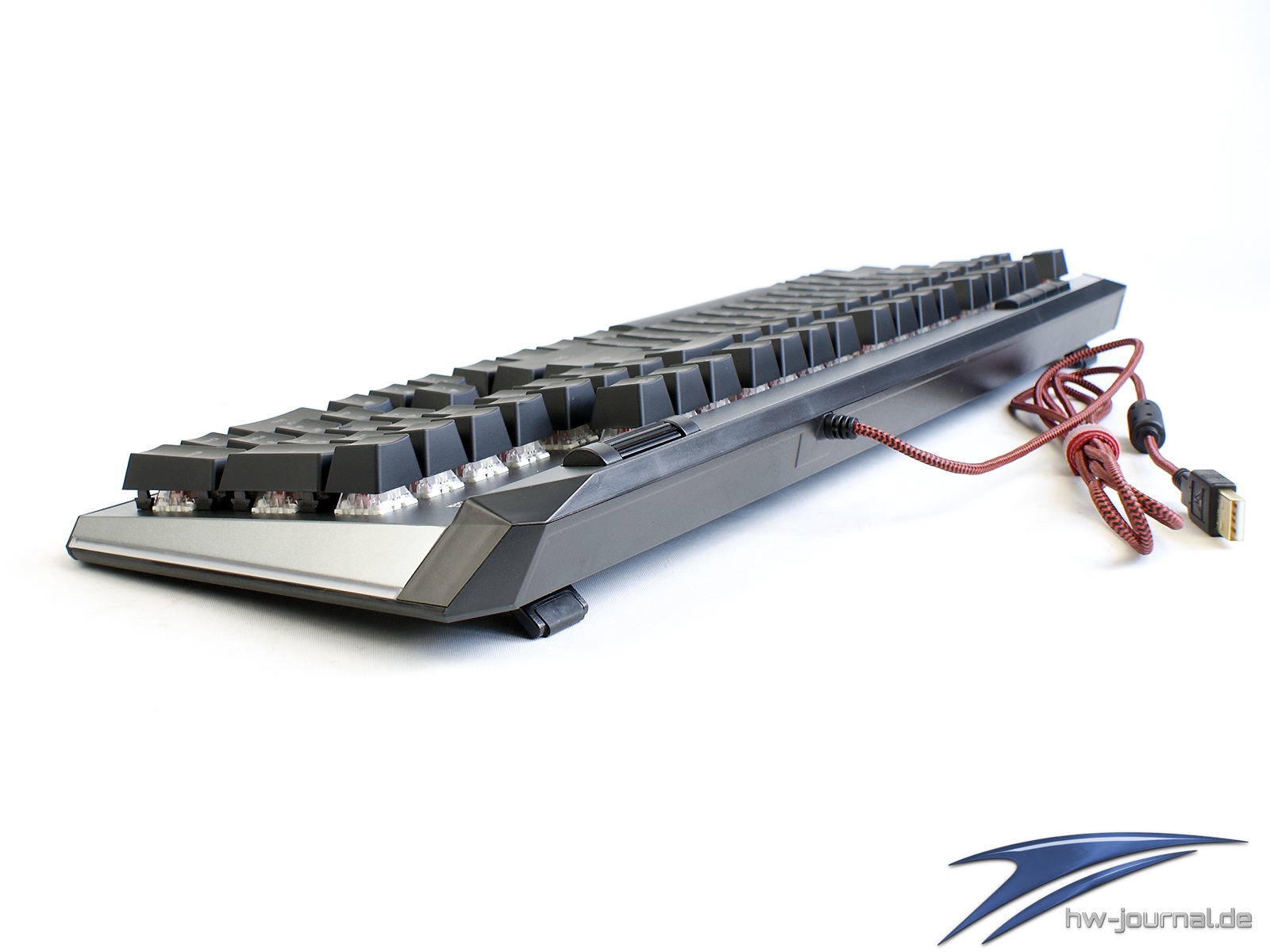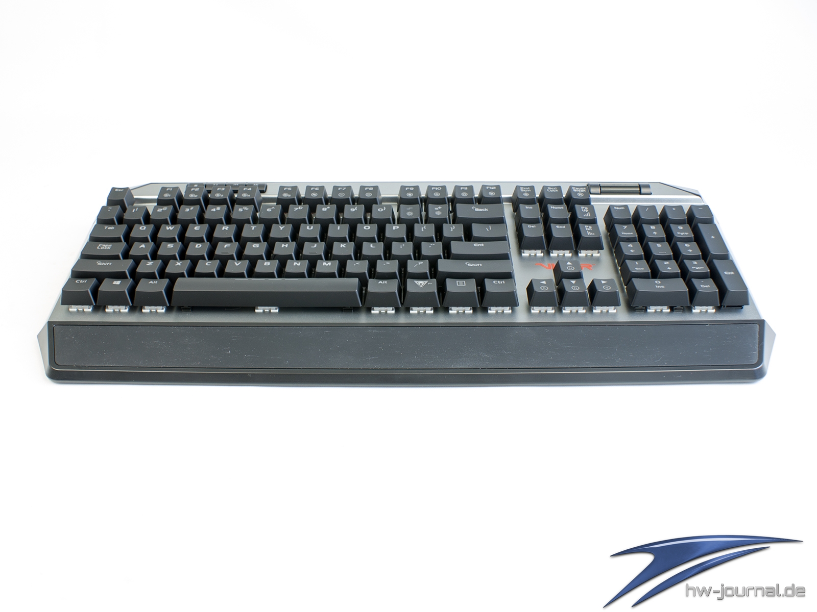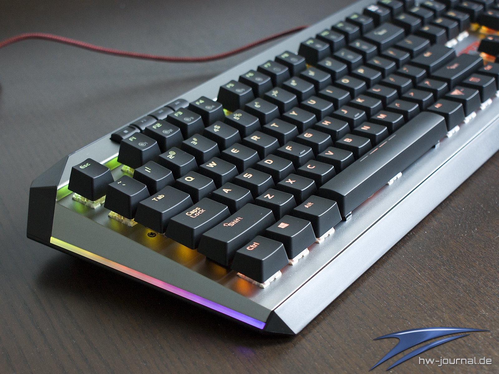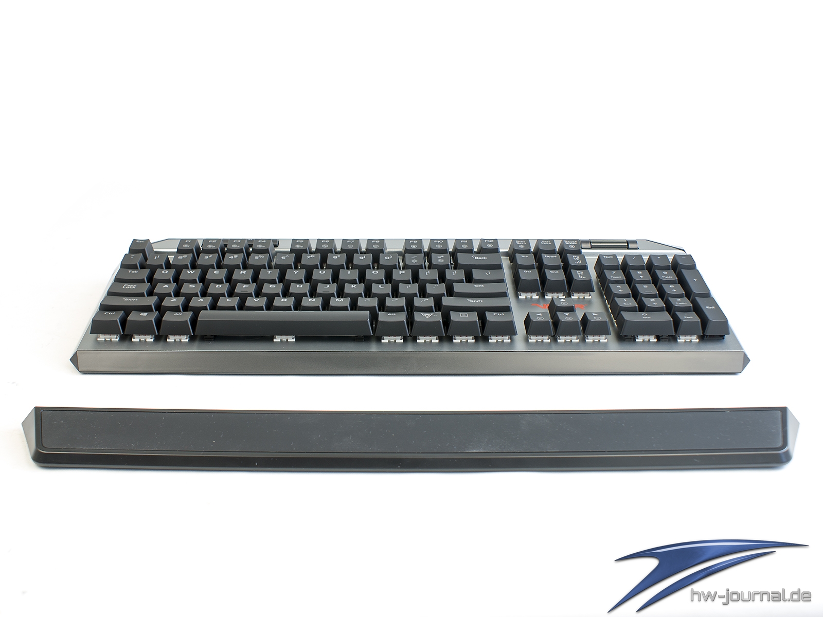 Etwas im Wege steht der Tastatur für eine gute Ergonomie die sehr schmale Handballenauflage. Unserem Empfinden nach hätte man ihr mehr Tiefe spendieren sollen. Generell macht sie eher den Eindruck, dass sie einfach nur den Zweck erfüllen soll, dass man das Vorhandensein abhaken kann. Schade, hier hat der Hersteller auf jeden Fall Potential verschenkt. Das gilt auch für die Wahl der Materialien. Leider ist nicht das Gehäuse aus Aluminium, sondern lediglich die Abschlussplatte. Die Ecken und Kanten wirken daher, auch wenn die Spaltmaße wirklich gut sind, einfach günstiger. Die Optik an sich wollen wir nicht wirklich in die Bewertung einfließen lassen, da diese subjektiv empfunden wird. Man kann aber schon sagen, dass die silberne Oberfläche sich beim Thema Beleuchtung positiv hervortut. Durch die helle Farbe und die leicht gestrahlte (?) Oberfläche wird das Licht sehr gleichmäßig gestreut. Dass die Ausleuchtung der Kappen mal wieder nicht sonderlich gleichmäßig ist, ist mal wieder nichts besonderes.