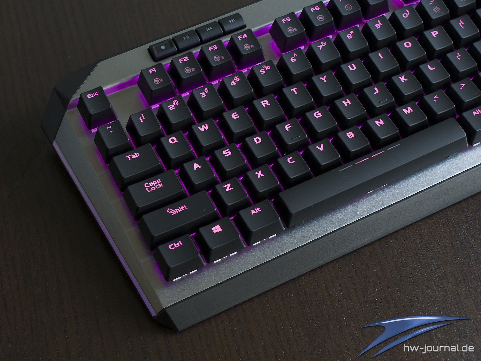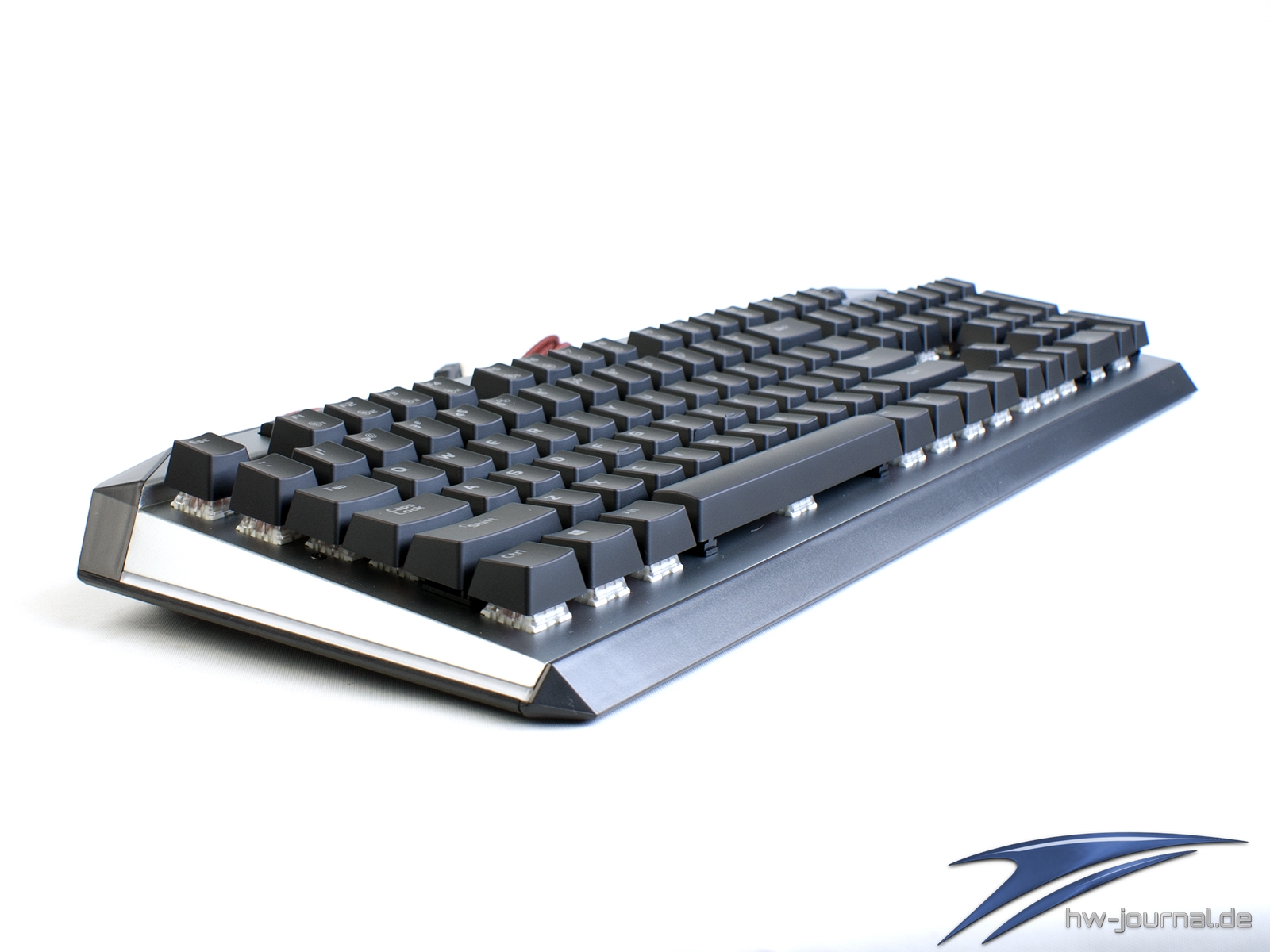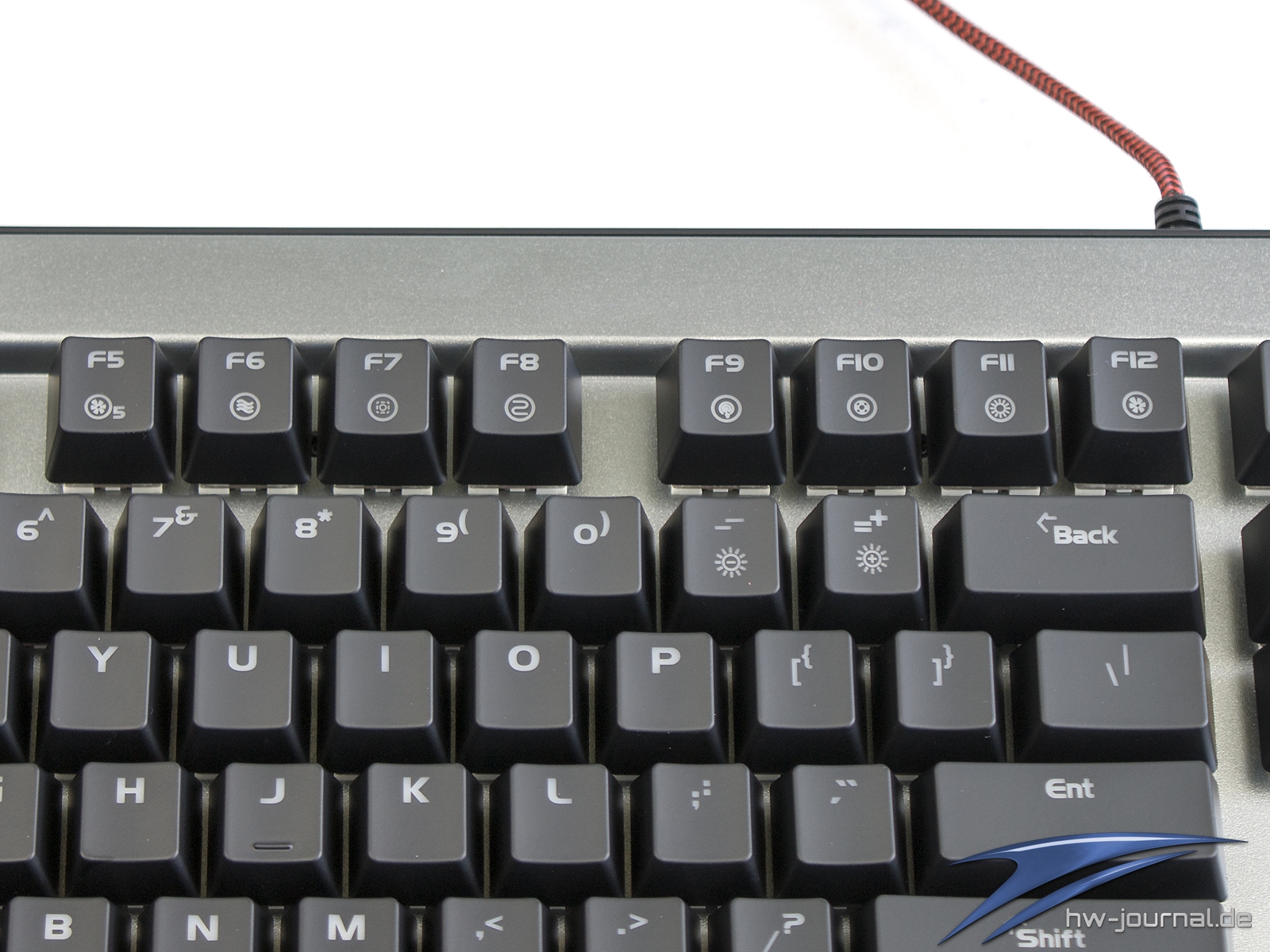 Etwas im Wege steht der Tastatur für eine gute Ergonomie die sehr schmale Handballenauflage. Unserem Empfinden nach hätte man ihr mehr Tiefe spendieren sollen. Generell macht sie eher den Eindruck, dass sie einfach nur den Zweck erfüllen soll, dass man das Vorhandensein abhaken kann. Schade, hier hat der Hersteller auf jeden Fall Potential verschenkt. Das gilt auch für die Wahl der Materialien. Leider ist nicht das Gehäuse aus Aluminium, sondern lediglich die Abschlussplatte. Die Ecken und Kanten wirken daher, auch wenn die Spaltmaße wirklich gut sind, einfach günstiger. Die Optik an sich wollen wir nicht wirklich in die Bewertung einfließen lassen, da diese subjektiv empfunden wird. Man kann aber schon sagen, dass die silberne Oberfläche sich beim Thema Beleuchtung positiv hervortut. Durch die helle Farbe und die leicht gestrahlte (?) Oberfläche wird das Licht sehr gleichmäßig gestreut. Dass die Ausleuchtung der Kappen mal wieder nicht sonderlich gleichmäßig ist, ist mal wieder nichts besonderes.