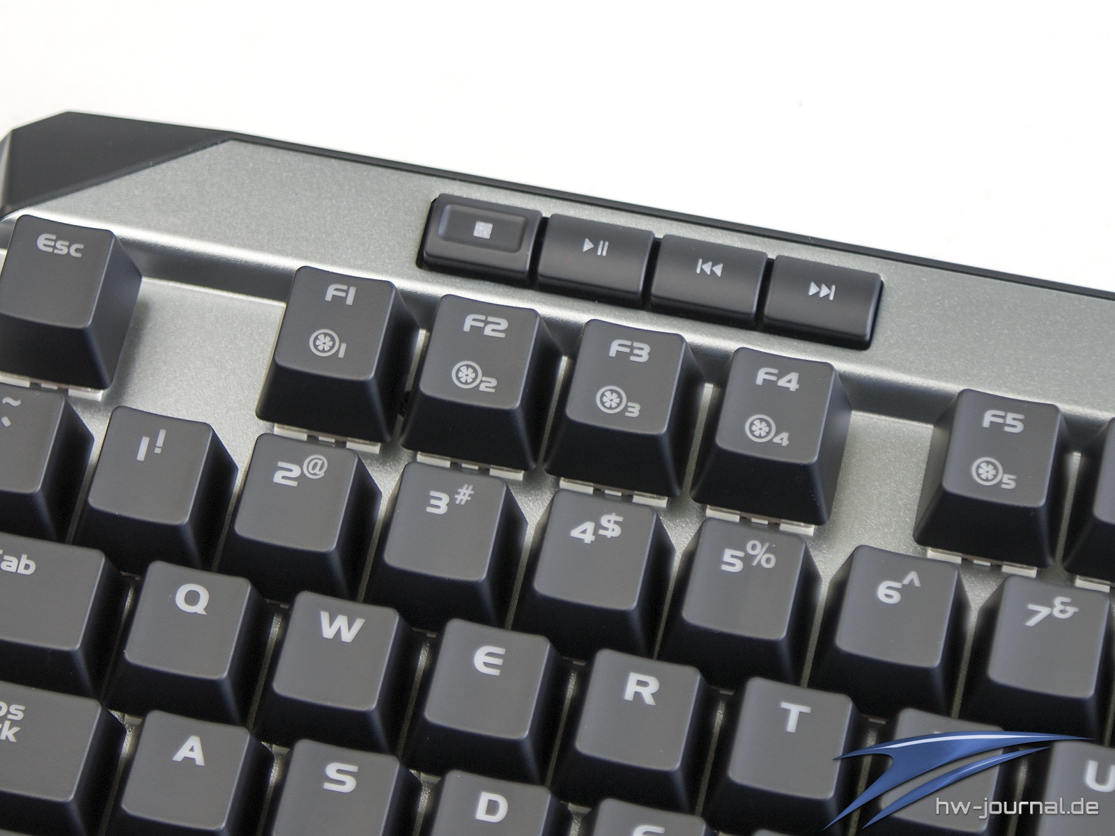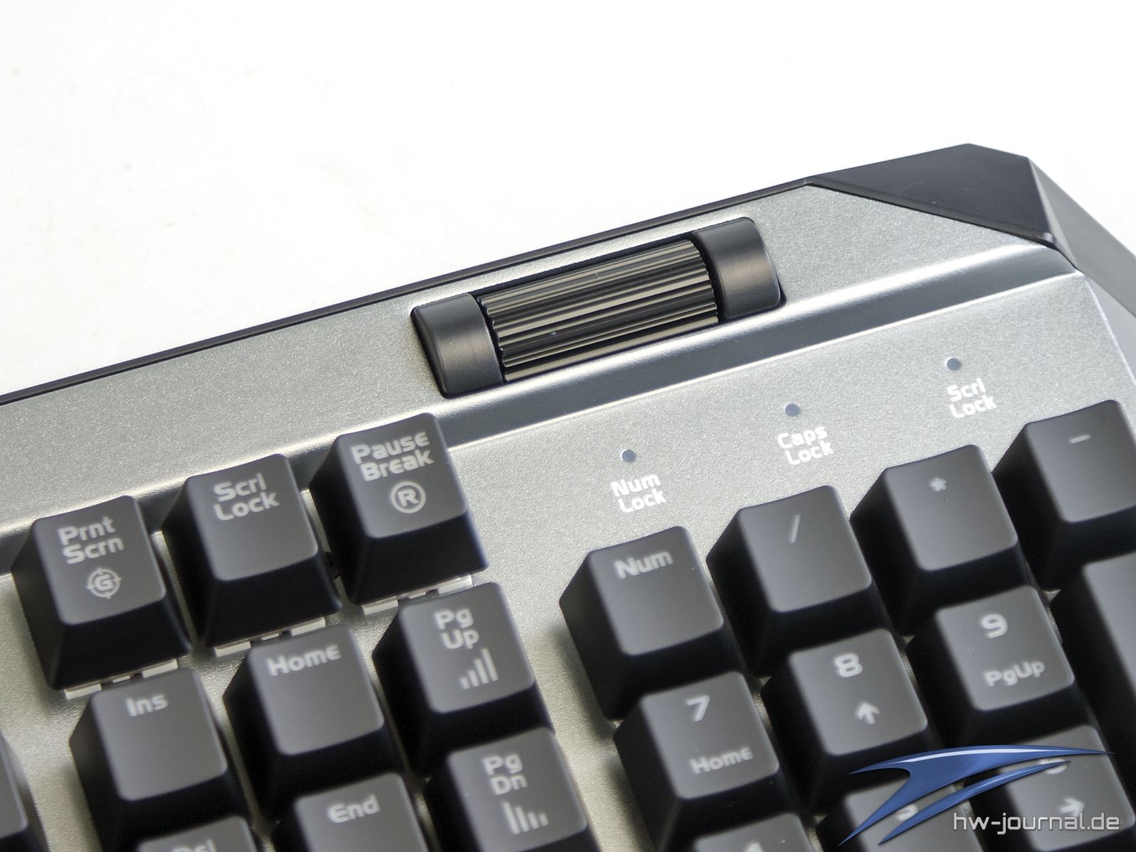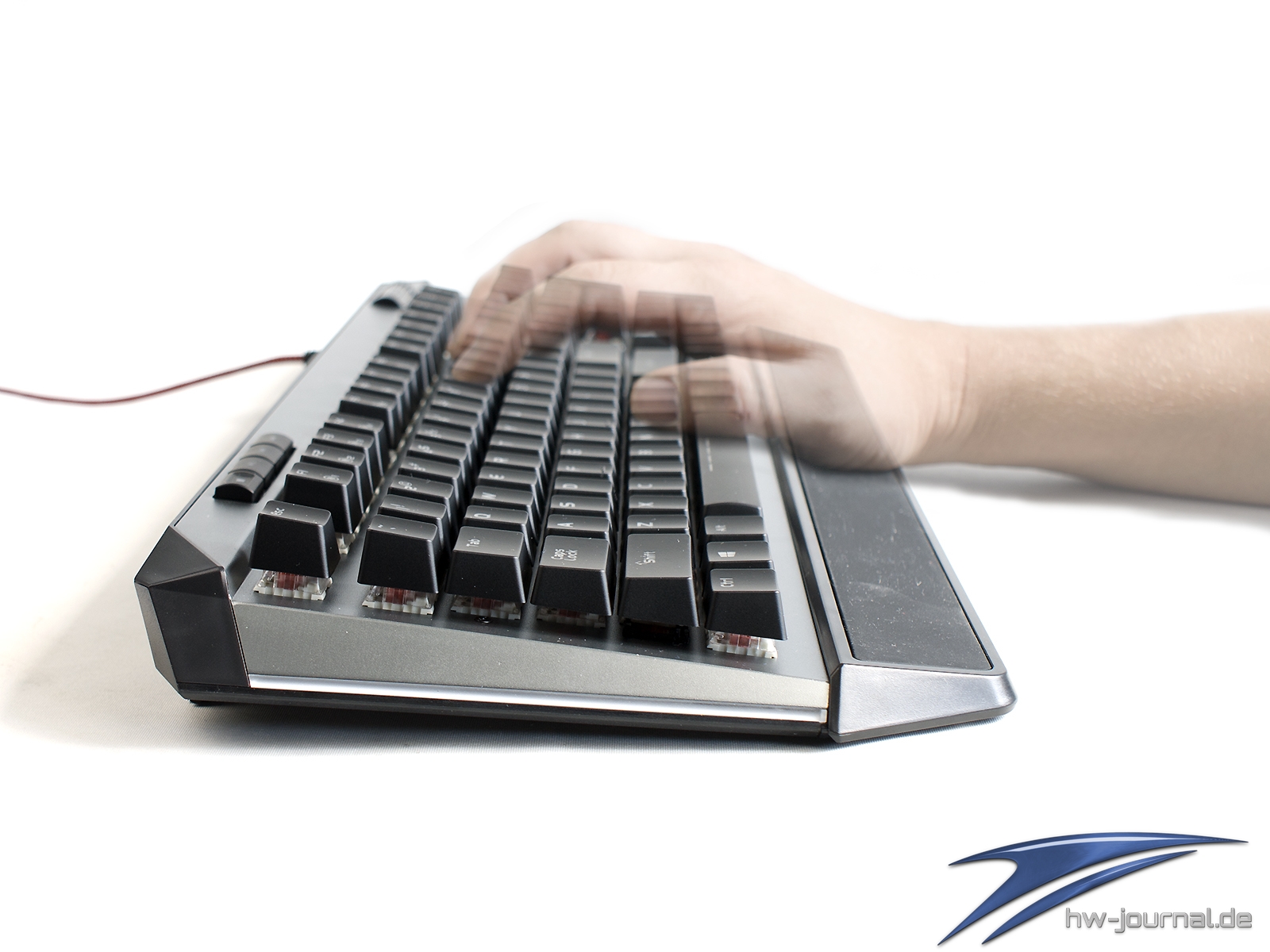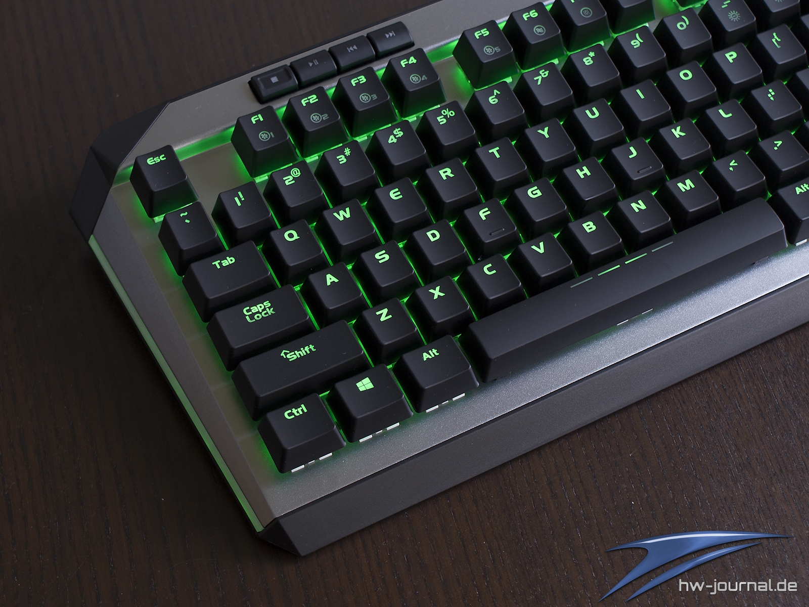 Etwas im Wege steht der Tastatur für eine gute Ergonomie die sehr schmale Handballenauflage. Unserem Empfinden nach hätte man ihr mehr Tiefe spendieren sollen. Generell macht sie eher den Eindruck, dass sie einfach nur den Zweck erfüllen soll, dass man das Vorhandensein abhaken kann. Schade, hier hat der Hersteller auf jeden Fall Potential verschenkt. Das gilt auch für die Wahl der Materialien. Leider ist nicht das Gehäuse aus Aluminium, sondern lediglich die Abschlussplatte. Die Ecken und Kanten wirken daher, auch wenn die Spaltmaße wirklich gut sind, einfach günstiger. Die Optik an sich wollen wir nicht wirklich in die Bewertung einfließen lassen, da diese subjektiv empfunden wird. Man kann aber schon sagen, dass die silberne Oberfläche sich beim Thema Beleuchtung positiv hervortut. Durch die helle Farbe und die leicht gestrahlte (?) Oberfläche wird das Licht sehr gleichmäßig gestreut. Dass die Ausleuchtung der Kappen mal wieder nicht sonderlich gleichmäßig ist, ist mal wieder nichts besonderes.