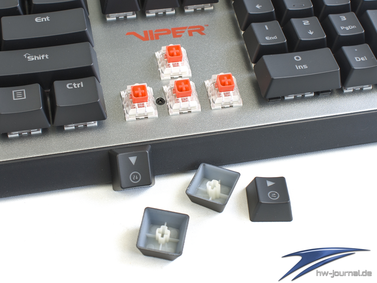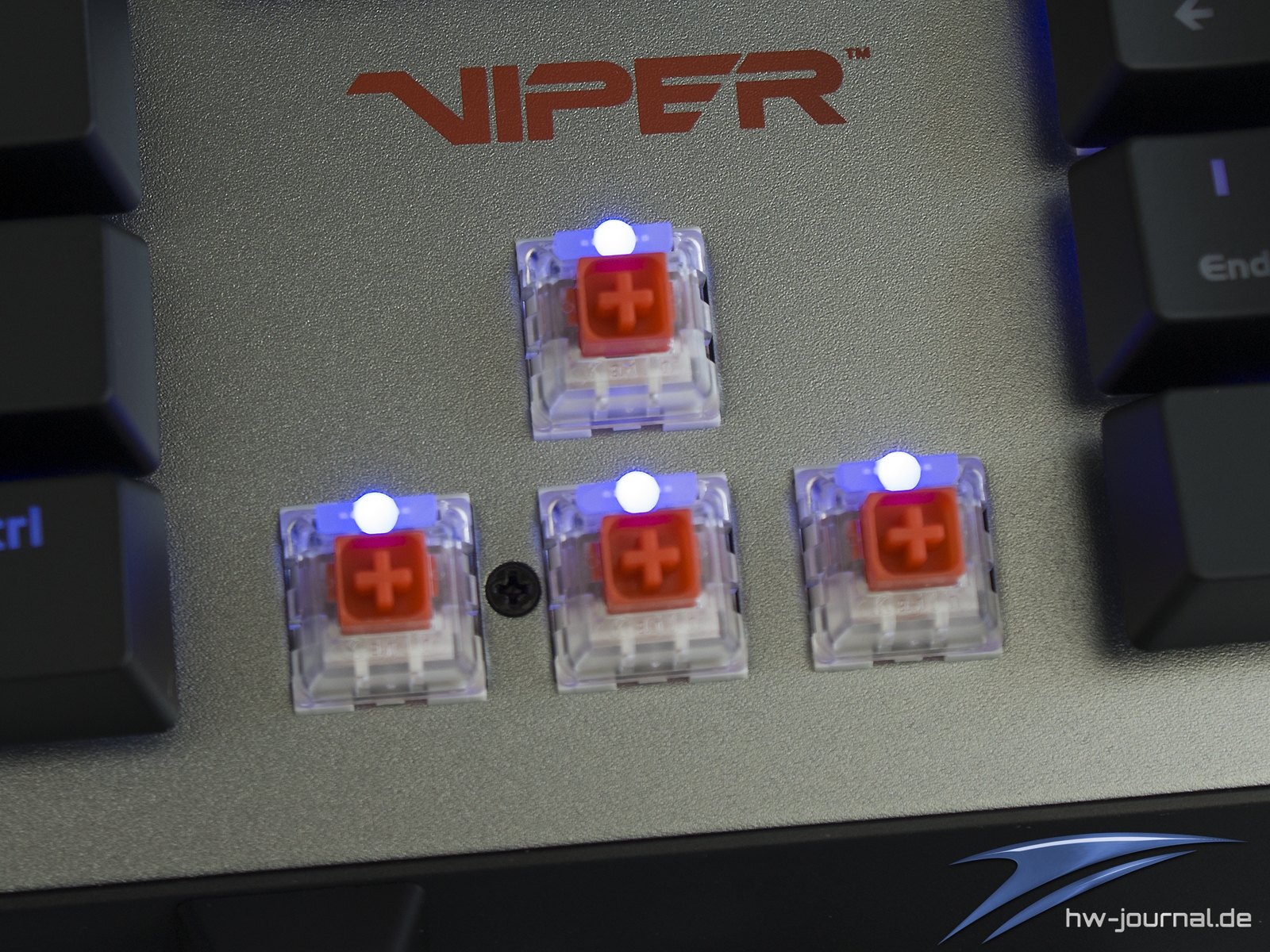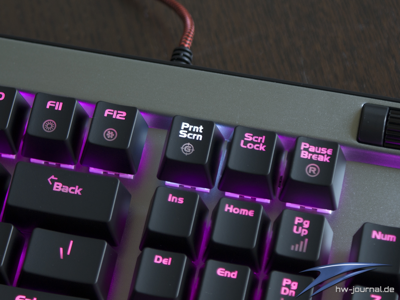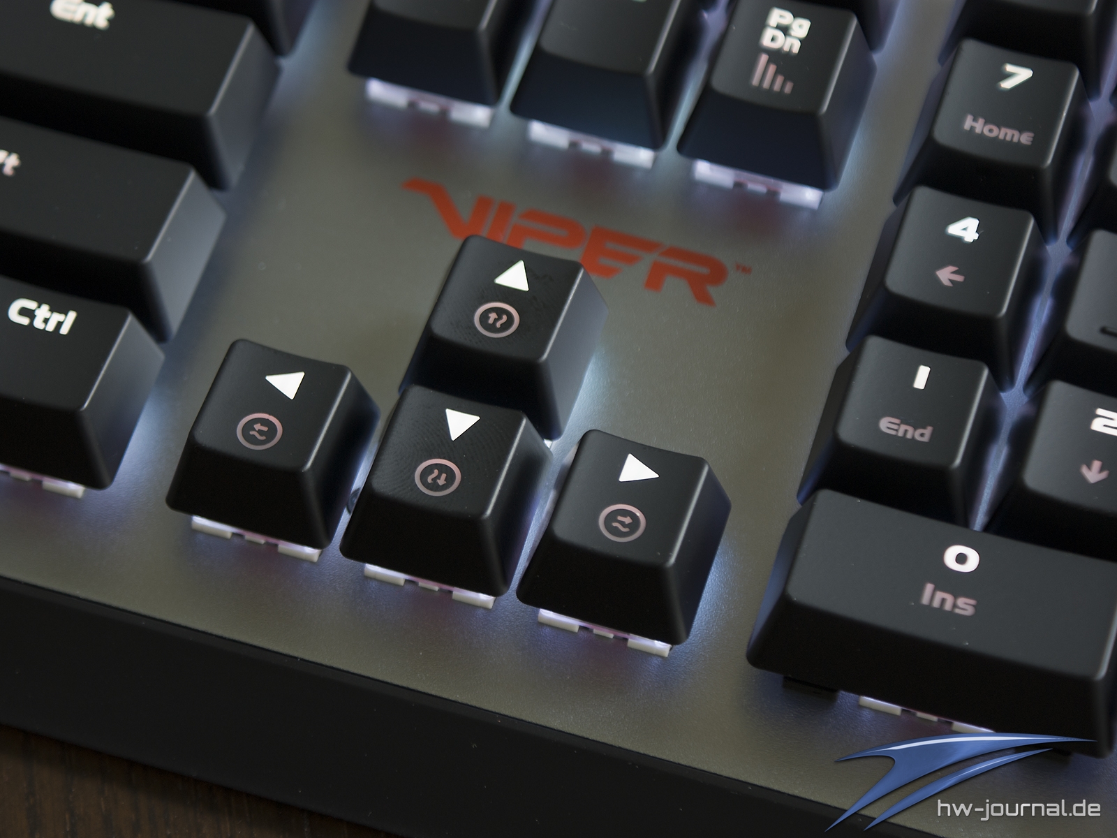 Recht schnell fällt aber auf, dass die Ausleuchtung der Tastenkappen mal wieder nicht ganz zufriedenstellend ist. Die verbauten Dioden strahlen recht Punktuell nach oben ab, weswegen die Symbole am oberen Rand der Kappen kräftig erscheinen, aber unterhalb des Stößels kommt kaum noch was an. Wieder mal schade. Aber alleine ist die Viper V765 mit diesem Problem nicht. Die Print-Taste visualisiert durch das weiße Leuchten, dass der Gaming-Mode eingeschaltet ist. Die Multimedia-Tasten sind leider nicht beleuchtet.