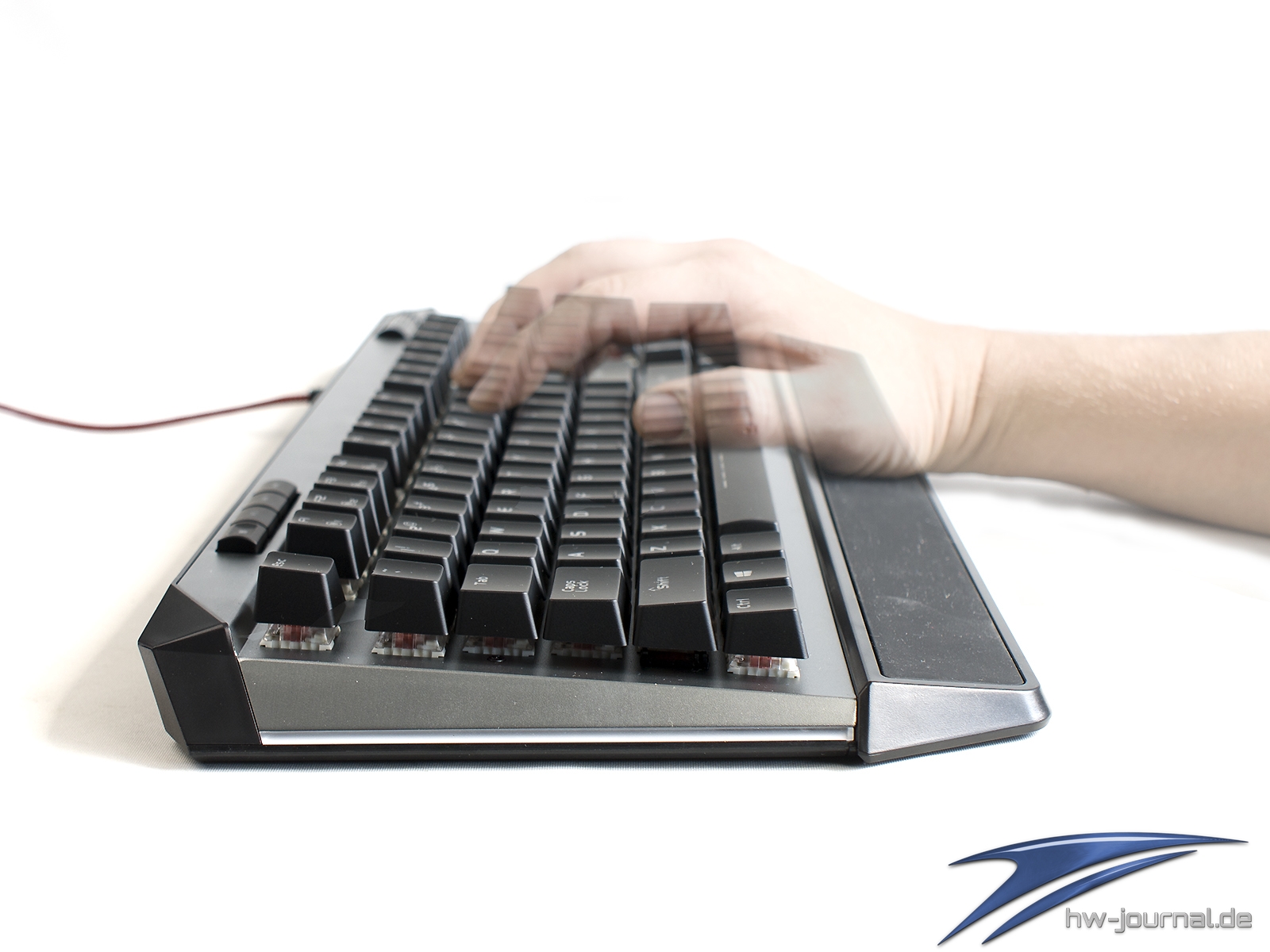 Die Schreibgeschwindigkeit ist auf der V765 aber dennoch von Anfang an sehr hoch. Die Schalter arbeiten sehr zuverlässig bzw. wurde während des gesamten Testbetriebs weder Prellen noch Haken festgestellt. Der Unterschied zu den Cherry MX Red wurde unter Zuhilfenahme der Cooler Master MK850 angestellt. Es mag Einbildung sein, aber gefühlt ist man mit den Kailh Box Switches tatsächlich etwas flinker unterwegs, wobei die Keycaps auch etwas weniger Spiel haben bzw. weniger wackelig sind. Dabei sind sie nicht übermäßig laut. Im Vergleich mit den Cherry MX Red wird eine ähnliche Klangcharakteristik an den Tag gelegt, wobei hier auch die Tastatur selbst eine Rolle spielt. Die Cherry MX Low Profile Rapidfire klingen in der Corsair Tastatur bspw. dumpfer bzw. weniger hell und maschinell. Das Zocken und auch Schreiben macht insgesamt aber sehr viel Spaß. Das Klicken der Tasten ist bei anderen Kontrahenten nicht weniger wahrnehmbar bzw. ist bei der Nutzung eines Headsets auch schnell ausgeblendet.