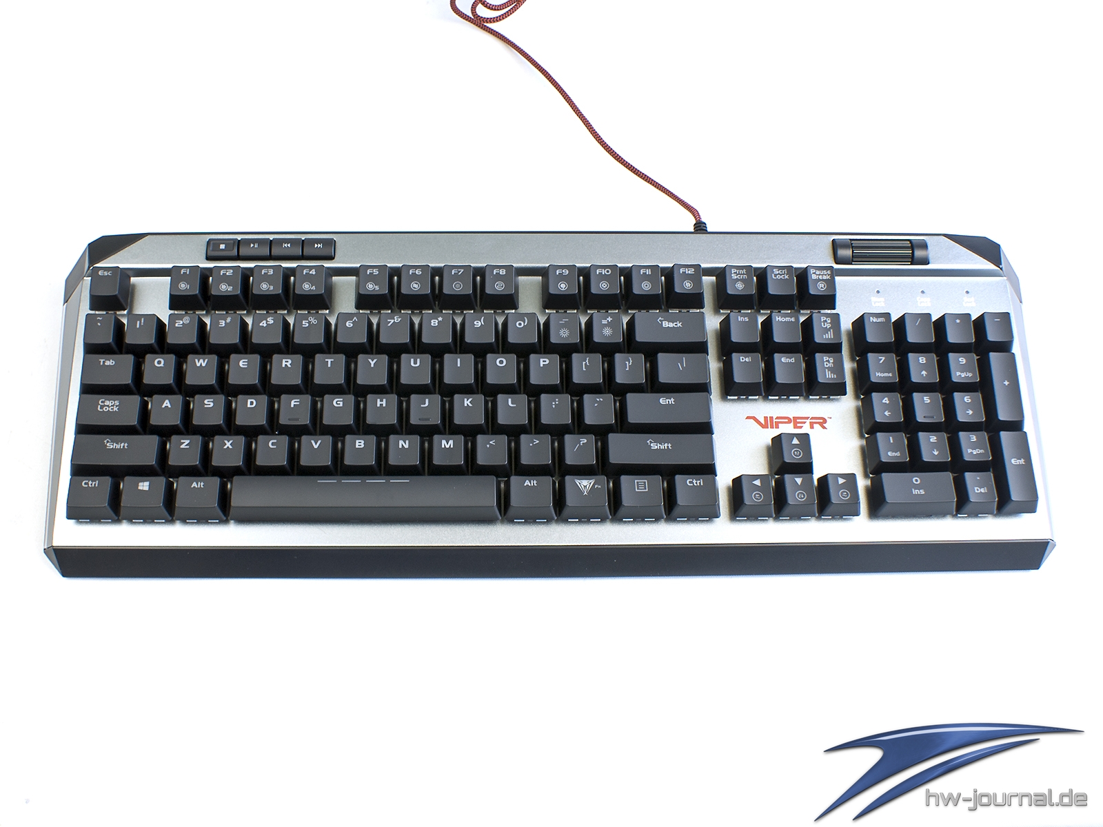 Optisch findet man bei der Viper V765 mehrere Parallelen zu anderen Tastaturen, was sich bei der Vielfalt des Marktes aber sicherlich auch nur noch schwer vermeiden lässt. So erinnert die Erhöhung am oberen, hinteren Rand etwas an die Corsair K70 MK.2 RGB, mit welcher die V765 auch die Aluminium-Top-Platte gemeinsam hat. Statt einer Bürstung der Oberfläche, hat der Hersteller diese hier Silber lackiert. Die Formgebung mit abfallenden Seiten erinnert hingegen ein klein wenig an die Cougar Attack X3 RGB.