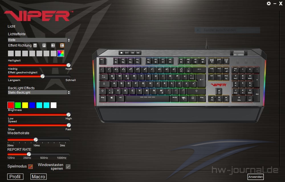 Die Software hat der Hersteller relativ einfach gehalten. Dabei erinnert sie optisch auch an den Viper RGB RAM. Individualisierungen kann man an der Beleuchtung vornehmen sowie an der Tastenbelegung.