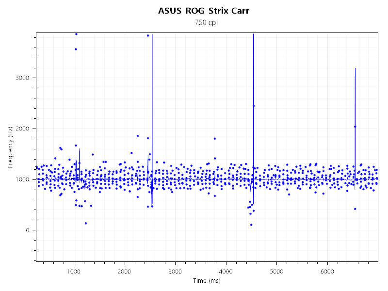Bei der Messung der Polling- bzw. Abfragerate mit 1000Hz zeigen sich leichtere Abweichungen, die unter anderem duch den 2.4GHz - Wireless-Betrieb zustande kommen. Im großen und ganzen beschränken sich die Abweichungen auf +- 200Hz. Die großen Ausreißer werden ebenfalls durch die kabellose Verbindung zustande kommen.