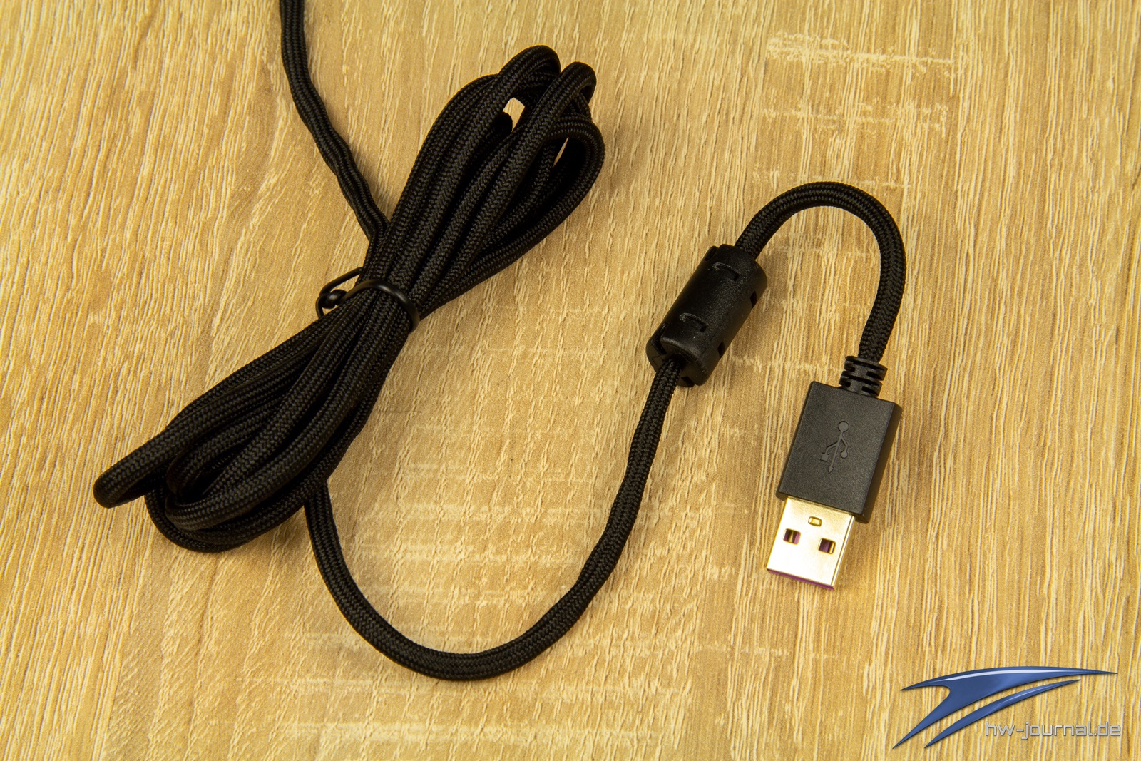 Um die Optik auch um ein ganzes Stück aufzuwerten, hat man im hinteren Bereich der Maus ein großes Logo untergebracht, welches natürlich in RGB-Farben erstrahlen kann. Direkt darunter ist ein transparenter Kunsstoff, welcher die gewählte Farbe optimal aufnimmt - das Ergebnis ist ein echter Hingucker. In der Praxis bewährt sich das doppelt verpackte Kabel, es ist kaum zu spüren. Auch das niedrige Gewicht der Maus bringt so einige Vorteile mit sich - vorerst. Mit der Zeit wird die Maus innerlich verstauben, die Löcher ermöglichen dies leider. Die "Technik" ist ungeschützt im Gehäuse verbaut.