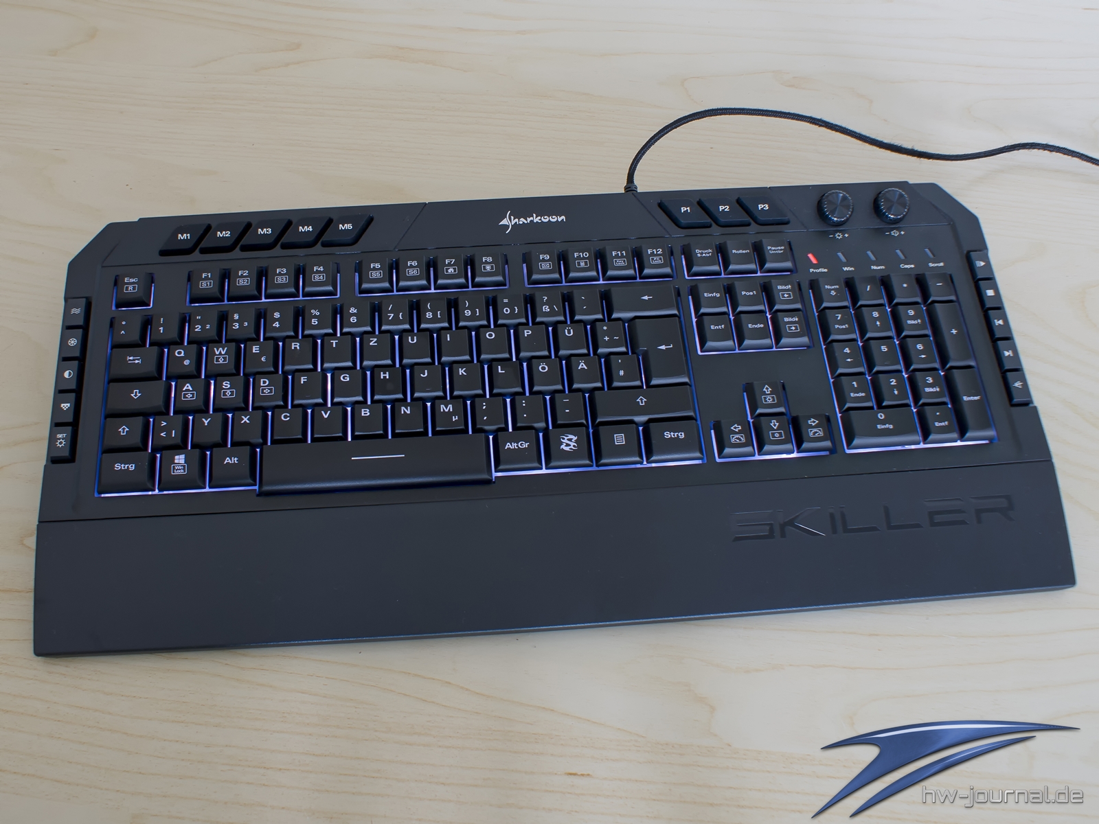 Wie diese, verfügt auch die Skiller SGK5 über eine Hanballenauflage. Hier wird sie aber praktischer per Magneten angeheftet und nicht eingeklipst. Neben den dedizierten Tasten, gibt es aber auch noch Zweitbelegungen. So lassen sich die Pfeiltasten auch auf WASD legen, es sind Shortcuts zu E-Mail, Desktop und dem "Computer" vorhanden. Auch für die Beleuchtung sind noch weitere Funktionen zugeordnet. F1 bis F6 bzw. S1 bis S6 lassen eine Einstellung der verschiedenen Beleuchtungszonen zu.