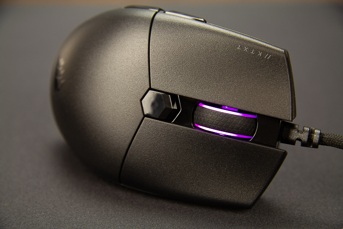 Wer denkt, dass die Corsair Katar und Pro XT äußerlich gleich aussehen, sollte einmal genau hinschauen. Währen die kabellose Variante eine Status-LED hinter dem Mausrad besitzt, so findet man beim neuen Modell nur die DPI- bzw. die Taste zum Wechseln des Profils vor. Die mit kleinen Dreiecken bestückte Fläche des Mausrads ist ebenso etwas schmaler, da es nun von einem RGB-Streifen auf jeder Seite verziert ist. Dieses kann in der Corsair iCUE, verfügbar für MacOS und Windows, mit einem beliebigen Lichtspiel programmiert werden.