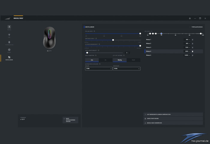 Im Bereich Einstellungen können unter anderem die fünf DPI-Stufen angepasst werden. Dabei muss allerdings in recht groben 50-DPI-Schritten vorgegangen werden. Die Lift-Off-Distance (LOD) kann in zwei Stufen (1 und 2 mm) angepasst werden.