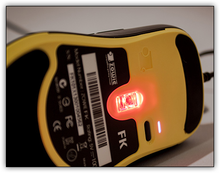 Auf der Unterseite der Maus sticht sofort die gelbe Bodenplatte ins Auge. Diese weist maustypisch in der Mitte die Aussparung für den ADNS 3090 Sensor von Avago vor, sowie zwei große Teflon-Mouseglides welche optimales Gleitverhalten gewährleisten sollen. Neben der Aussparung für den Sensor befindet sich ein kleiner Druckknopf, der für die Einstellung der drei DPI-Stufen verantwortlich ist. Um zu signalisieren, welche DPI-Stufe aktiv ist, hat Zowie über dem Druckknopf eine LED installiert, welche in drei verschiedenen Farben die einzelnen DPI-Stufen signalisiert.