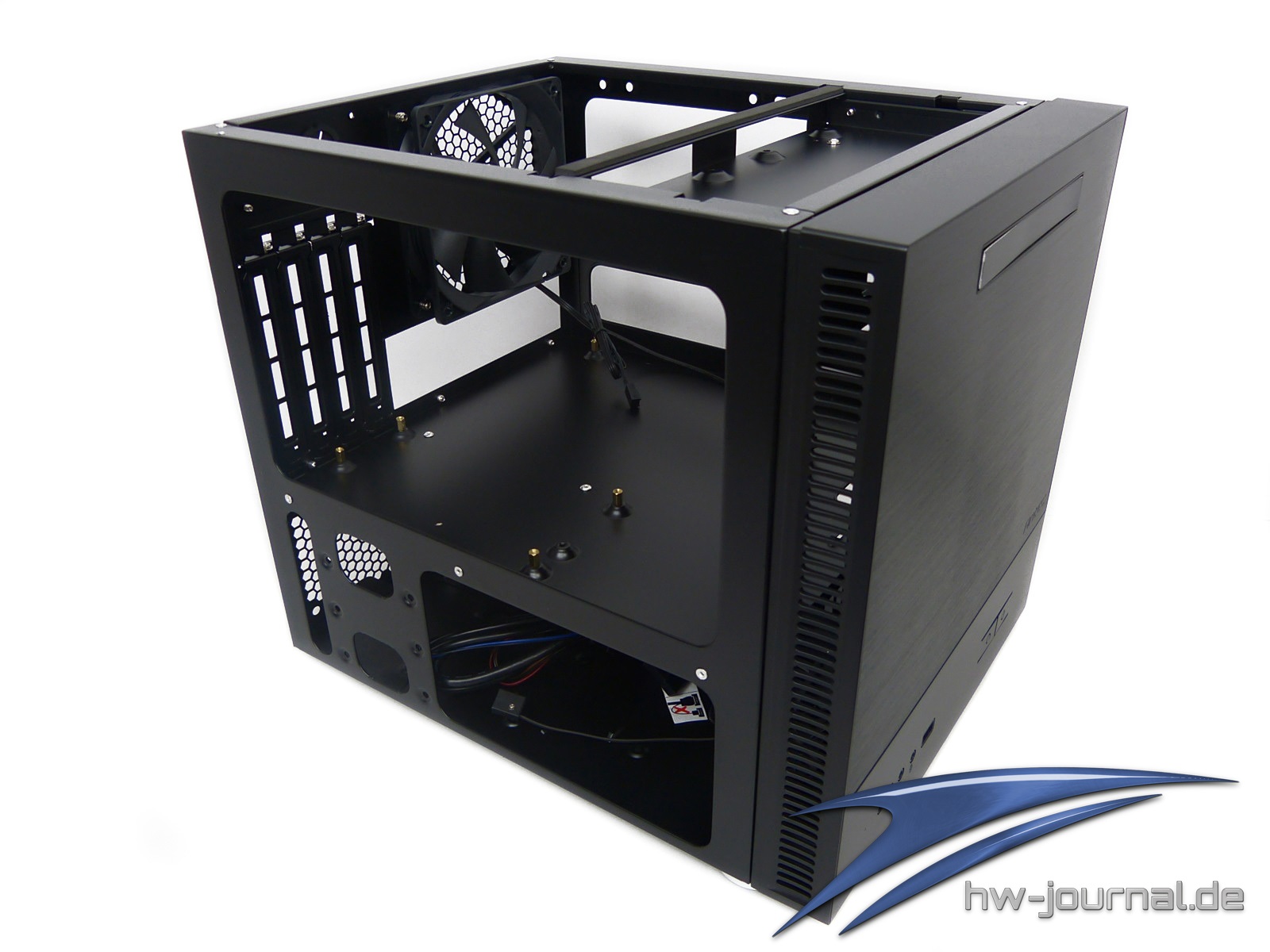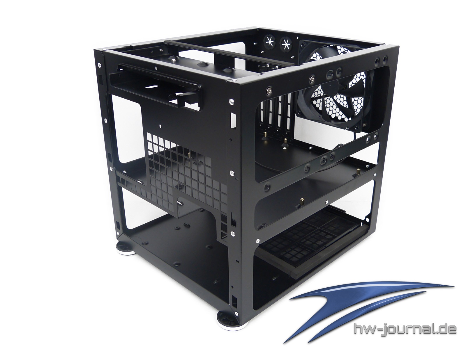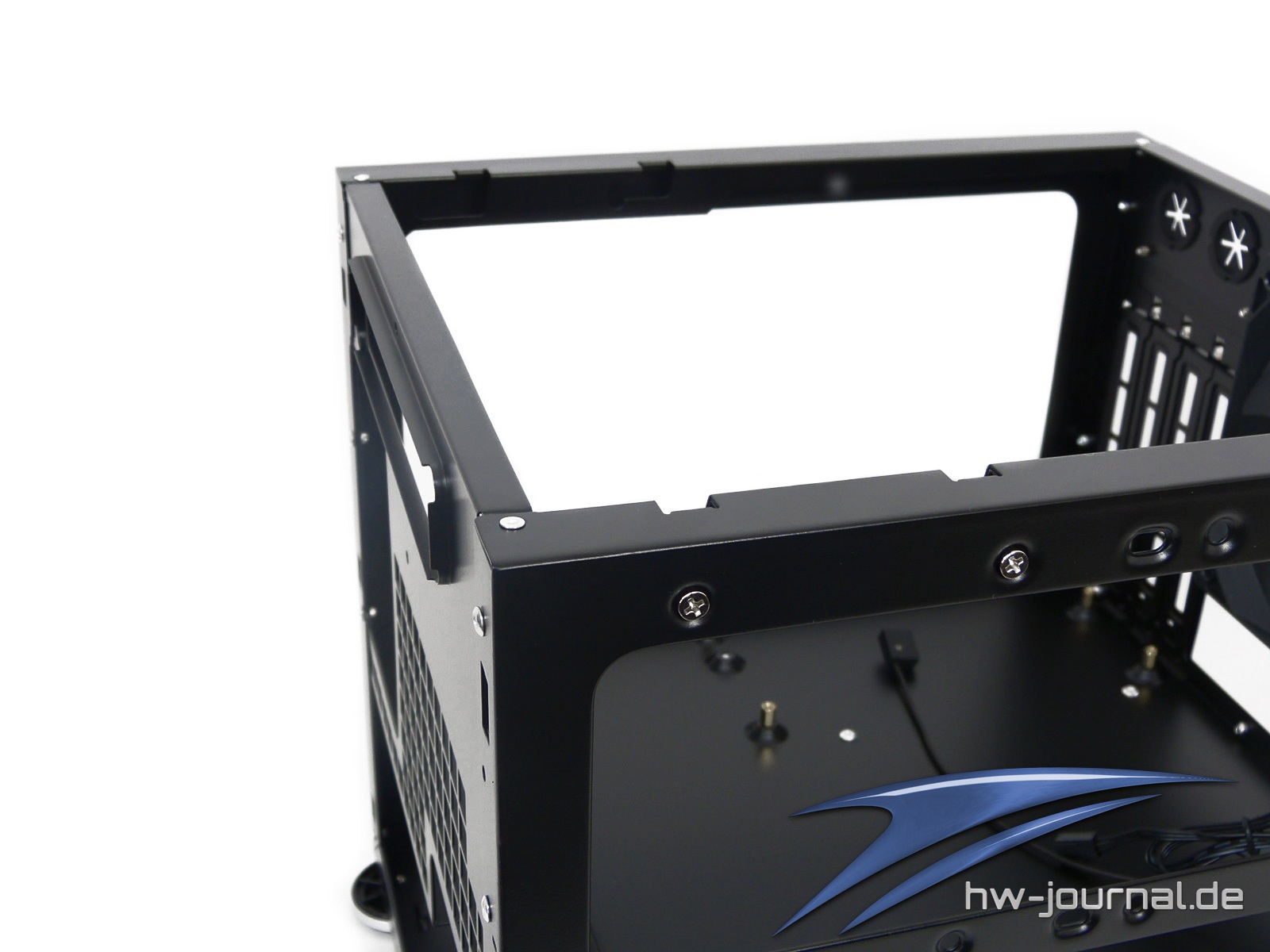 Der durchgehende Gehäusedeckel wird mittels der drei angenehm händelbaren Thumbscreews erst gelöst und dann abgenommen. Dieser Vorgang geht sehr leicht und angenehm von der Hand. Anschließend bestätigt sich das Bild, welches man schon beim ersten Äußeren Eindruck vernehmen konnte. Der Rahmen ist sehr sauber und hochwertig verarbeitet. Keinerlei scharfe Kanten oder unsauber verarbeitete Stellen tun sich auf. Insgesamt ein überraschend und zugleich sehr gutes Gesamtbild! Das Chassis selbst hat zwar wenige modulare Funktionen, dafür sinnvolle und ausgeklügelte.