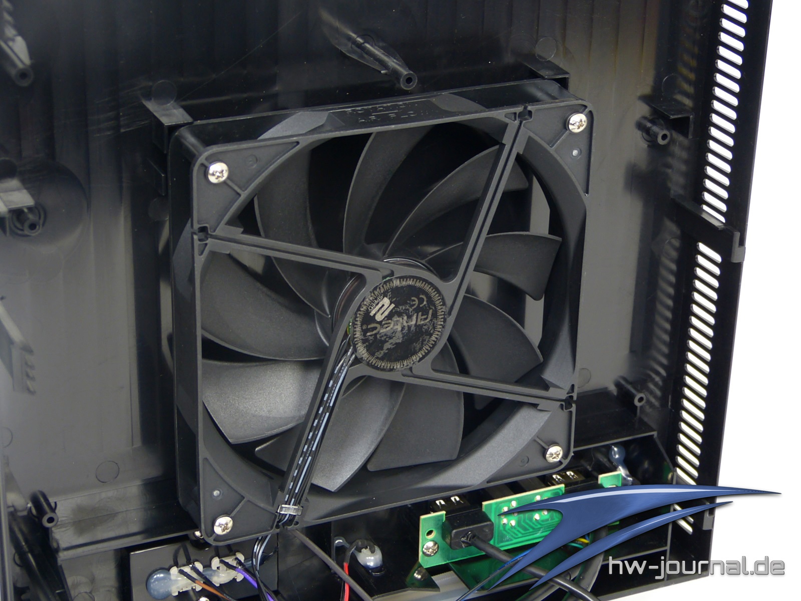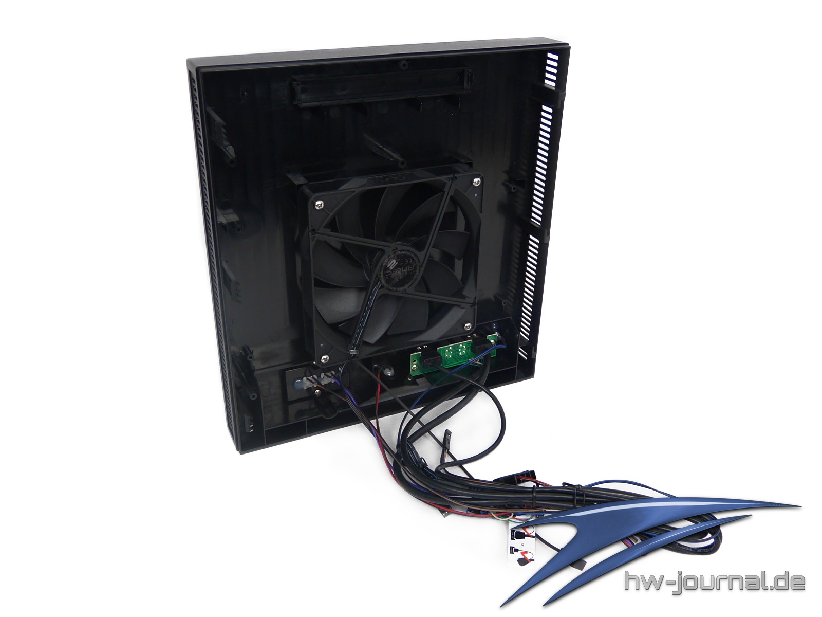 Die Front musst für die Montage mitunter sogar zwingend abgenommen werden, so dass man einfacher die Kabel verlegen kann. Dies geht sehr einfach und erfolgt über einen kleinen „Ruck“. Gehalten wird die Frontabdeckung mittels kleiner Kunststoffnasen. Das sich auftuende Kabelwirrwarr sollte sich aber relativ leicht bändigen lassen, da fast alles Kabel ummantelt sind. Die beiden vorinstallierten Lüfter (140mm vorne, 120mm hinten), sind beide mit einer kleinen angebrachten Lüftersteuerung regulierbar: low und high. Wie sich dies im Kühlverhalten bzw. Geräuschkulisse auswirkt, wird im Praxistest geklärt.