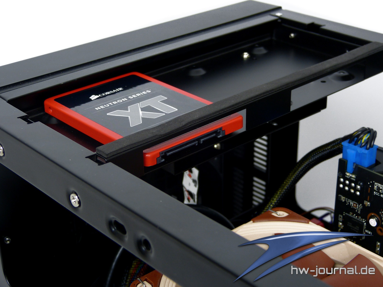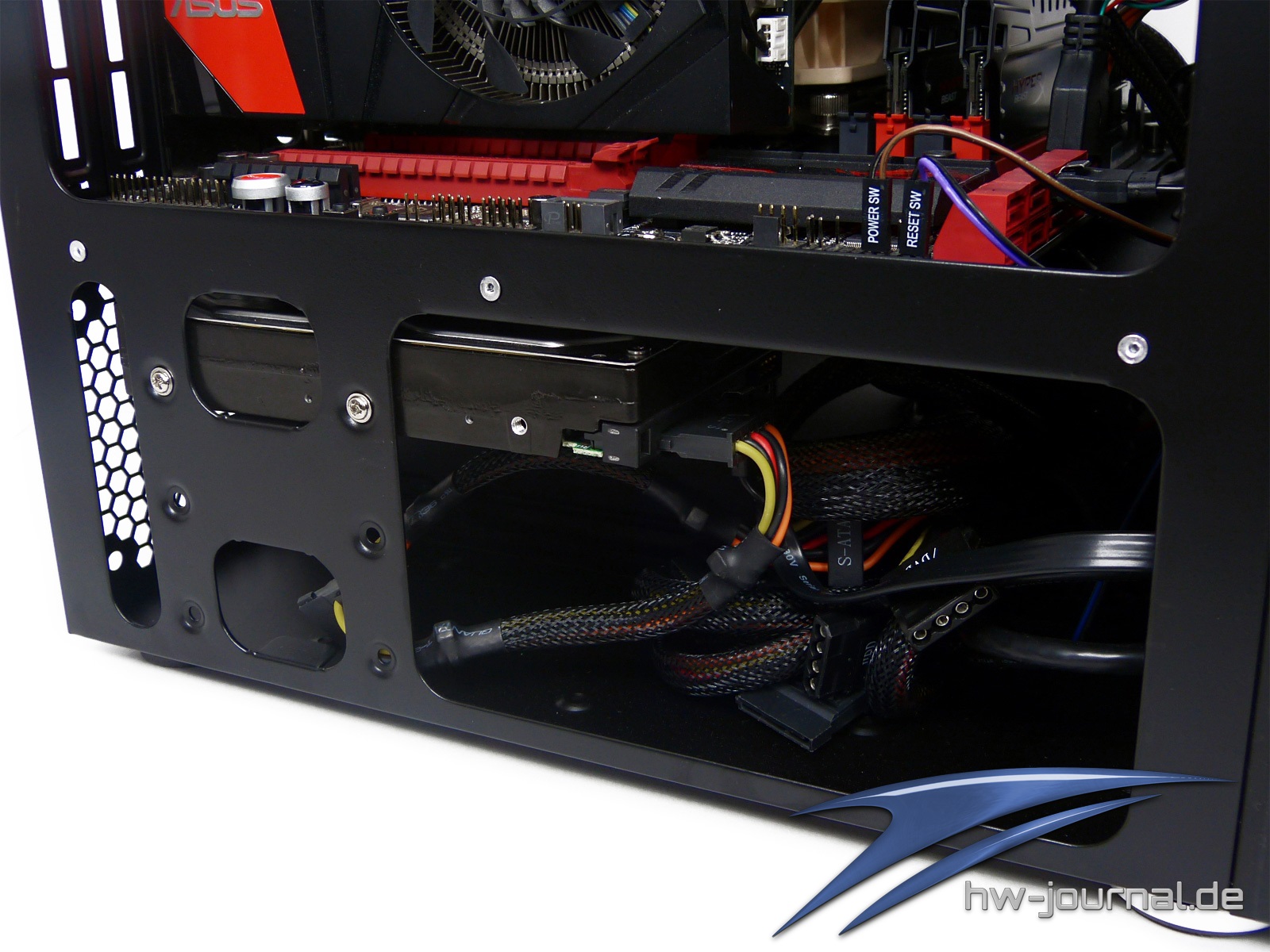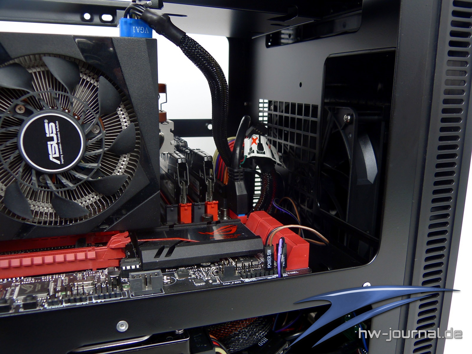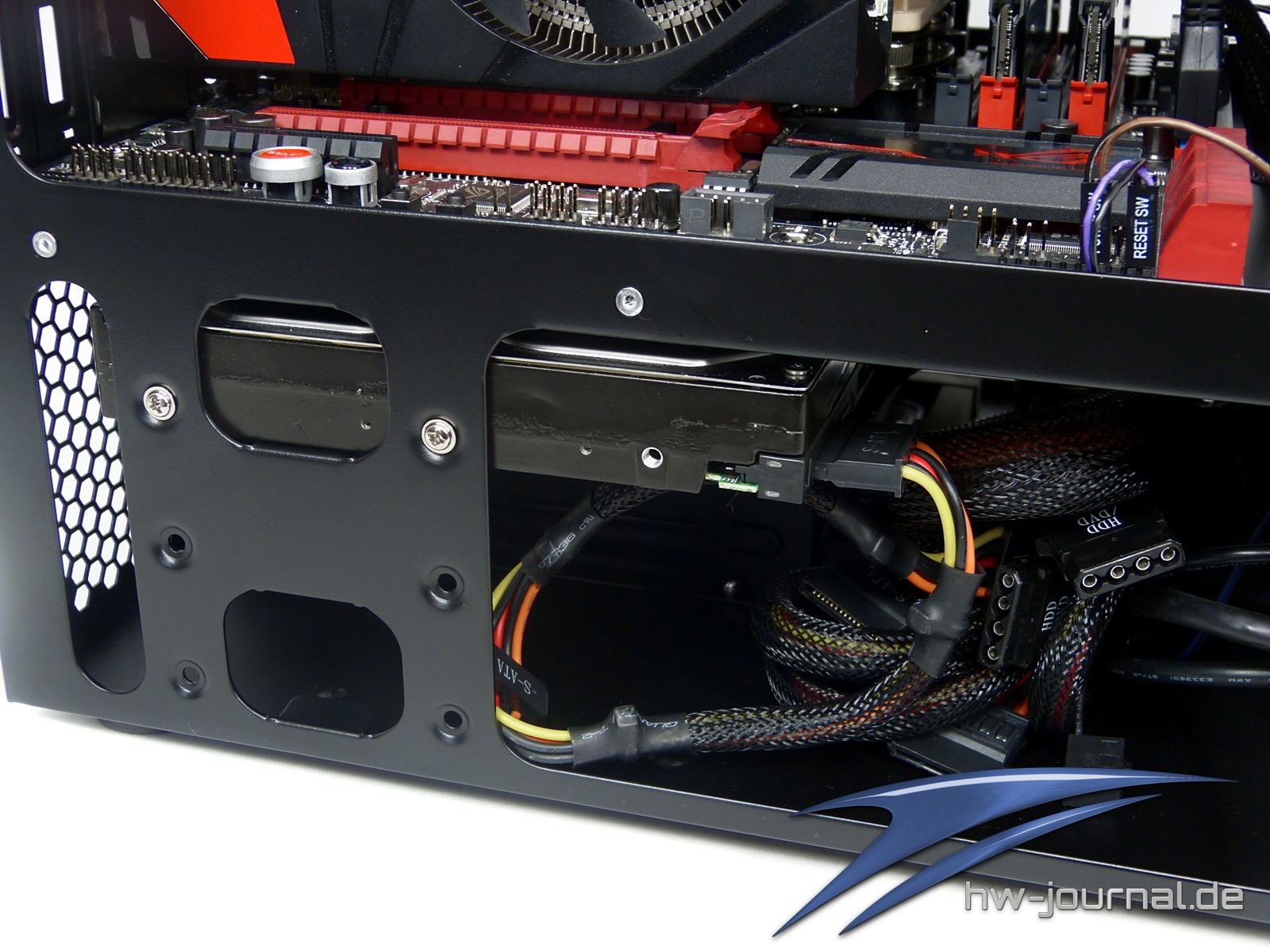 Zwar muss der Anwender von einer werkzeuglosen Montage absehen, wie es unter anderem bei Corsair Carbide Air 240 umsetzt wurde, dafür sind alle Stellen im Gehäuse auch leicht zugänglicher. Auch der nach oben hin ausgerichtete 6+2-Pin-Stecker für die Grafikkarte, welcher bereits mehrmals für Probleme beim Zusammenbau sorgte, kann unbeschadet verstaut werden. Wie zu sehen, werden die Datenträger fest mit Schrauben am Chassis verschraubt – die Zugänglichkeit bleibt aber weitestgehend erhalten.