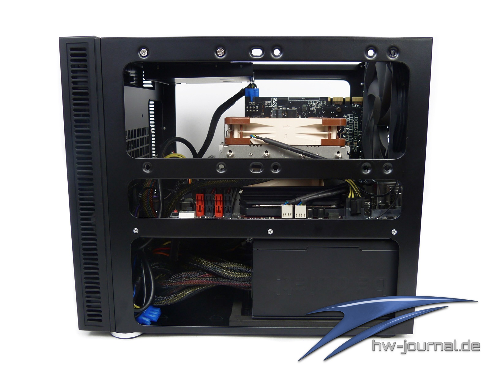 Im Vergleich zu sonstigen Gehäuse-Konstellationen gelingt der Einbau der Hardware sowas von einfach, dass dieser binnen kürzester Zeit fertig ist. Ein geschultes Händchen sei an dieser Stelle aber mal vorausgesetzt. Auch wenn das Kammersystem eher rudimentär vorhanden ist, so trägt es mehr als positiv dazu bei, den Zusammenbau des verwendeten Testsystems ohne jegliche Komplikation umzusetzen. Ein Blick ins Detail gibt noch mehr Aufschluss: