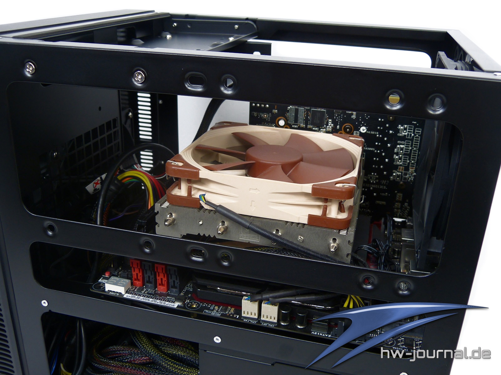 Zwischen Mainboard und Frontabdeckung wird dann deutlich, wie zentral ausgelegt der Kabelschacht ist. Es ist im Übrigen der Einzige, über dem Kabel von unten nach oben geführt werden können. Der hinter der Front verbaute 140mm Lüfter ist so ausgerichtet, dass er den oberen und unteren Teil des Gehäuseinneren kühlen kann. Beim Rückwertigen Anblick wird dann deutlich, dass sogar ein potenter Tower-Kühler Platz hätte, vorausgesetzt man entfernt die Halterung für das Slot-In-Laufwerk. Am Ende bleibt ein sehr positiver Eindruck. Kommen wir nun zum Praxistest und den Leistungswerten.