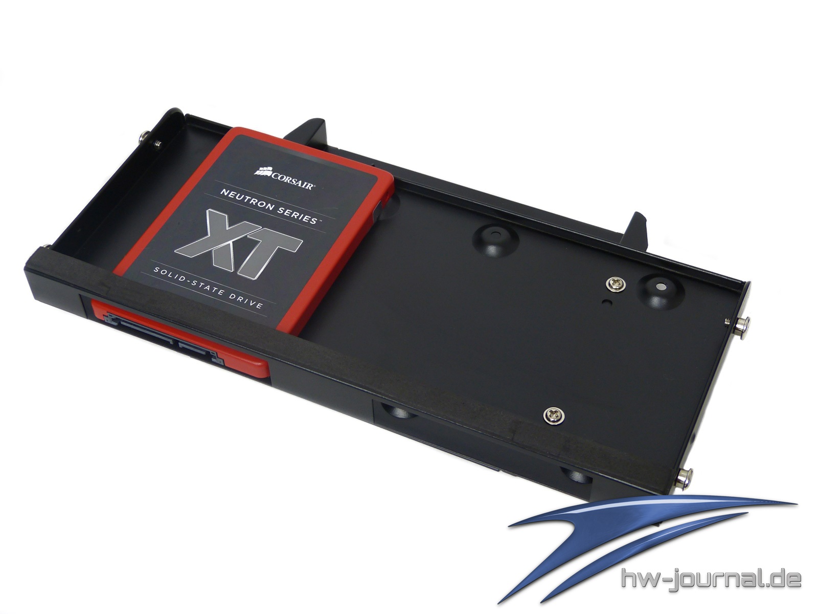 Bei der Montage der Datenträger verlässt sich der Hersteller auf ein recht simples Verfahren. Beginnen wir mit den 2,5 Zoll Laufwerken im Top. Diese werden auf eine kleine Halterung geschraubt und anschließend in den Gehäuserahmen eingehängt. Eine Entkopplung gibt es an dieser Stelle leider nicht. Des Weiteren kann es sogar in diversen Fällen notwendig sein, diese Halterung zu entnehmen, falls etwaige Hardware-Konstellationen sich sonst nicht unterbringen lassen. Die 3,5 Zoll Laufwerke werden in der unteren Kammer verstaut bzw. verschraubt. Eine Entkopplung kommt ebenfalls nicht zum Einsatz, da die Datenträger direkt mit dem Chassis verschraubt werden müssen.