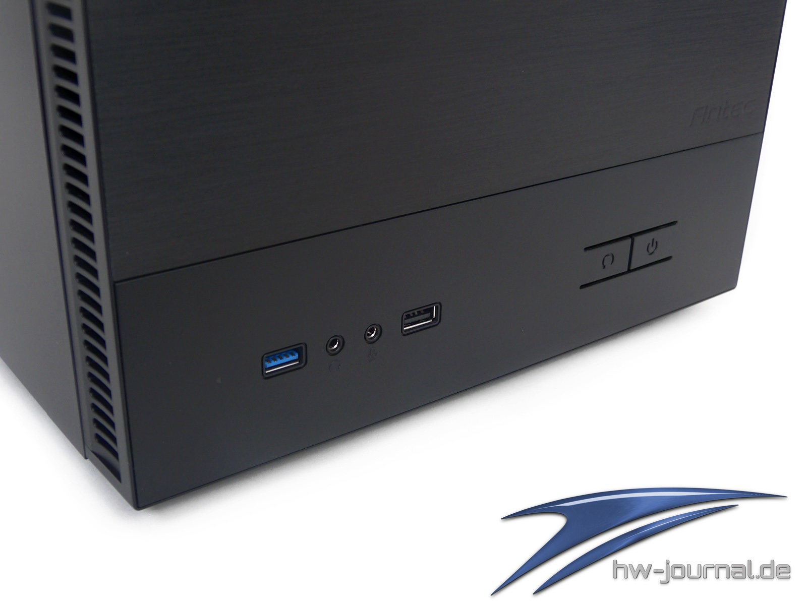 Im unteren Bereich der Gehäusefront finden sich die gewöhnlichen Steckplätze. Neben einem dezent gestaltetem Start- bzw. Reset-Button, kann der Anwender zwischen einem USB-3.0- oder einem USB-2.0-Port wählen. Für die klangliche Unterstützung sorgen die beiden 3,5 Millimeter Klinkenstecker. An den seitlichen Gehäusewänden befinden sich großzügig gestaltete Lufteinlässe, welche optional noch mit Lüfter versehen werden können.