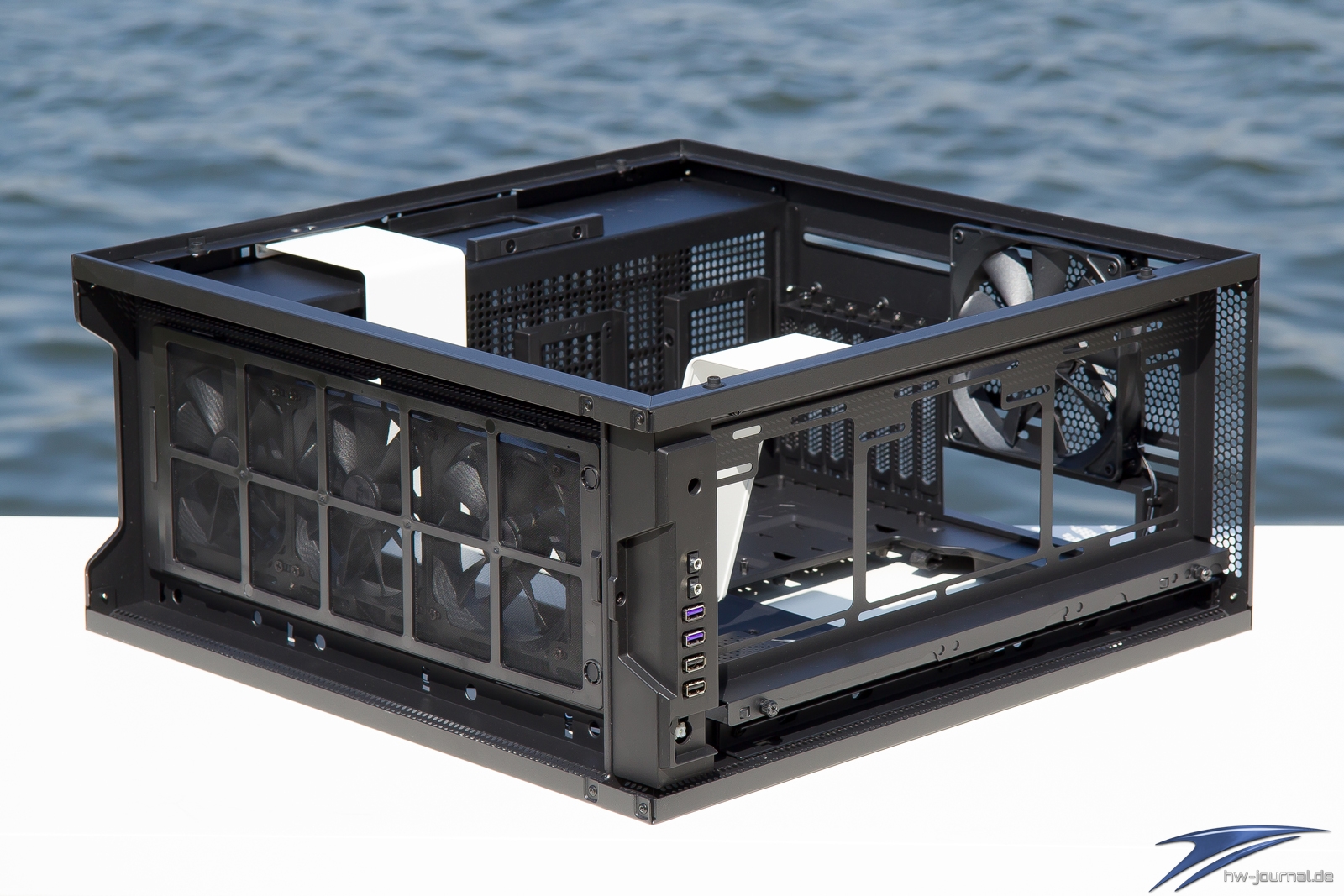 Die Rückseite ist wie das Innere im Gehäuse in schwarz gehalten. Oben links neben dem Lufteinlass befindet sich der Push-Button zum Lösen der Abdeckung der Hinterseite. Darauf folgt ein 140mm Lüfter, der sich bei Bedarf verschieben lässt. Ebenfalls lässt sich erkennen, dass das Netzteil mithilfe eines Brackets fixiert wird. Hier muss also doppelt geschraubt werden, auch wenn bereits Rändelschrauben am Bracket befestigt sind.