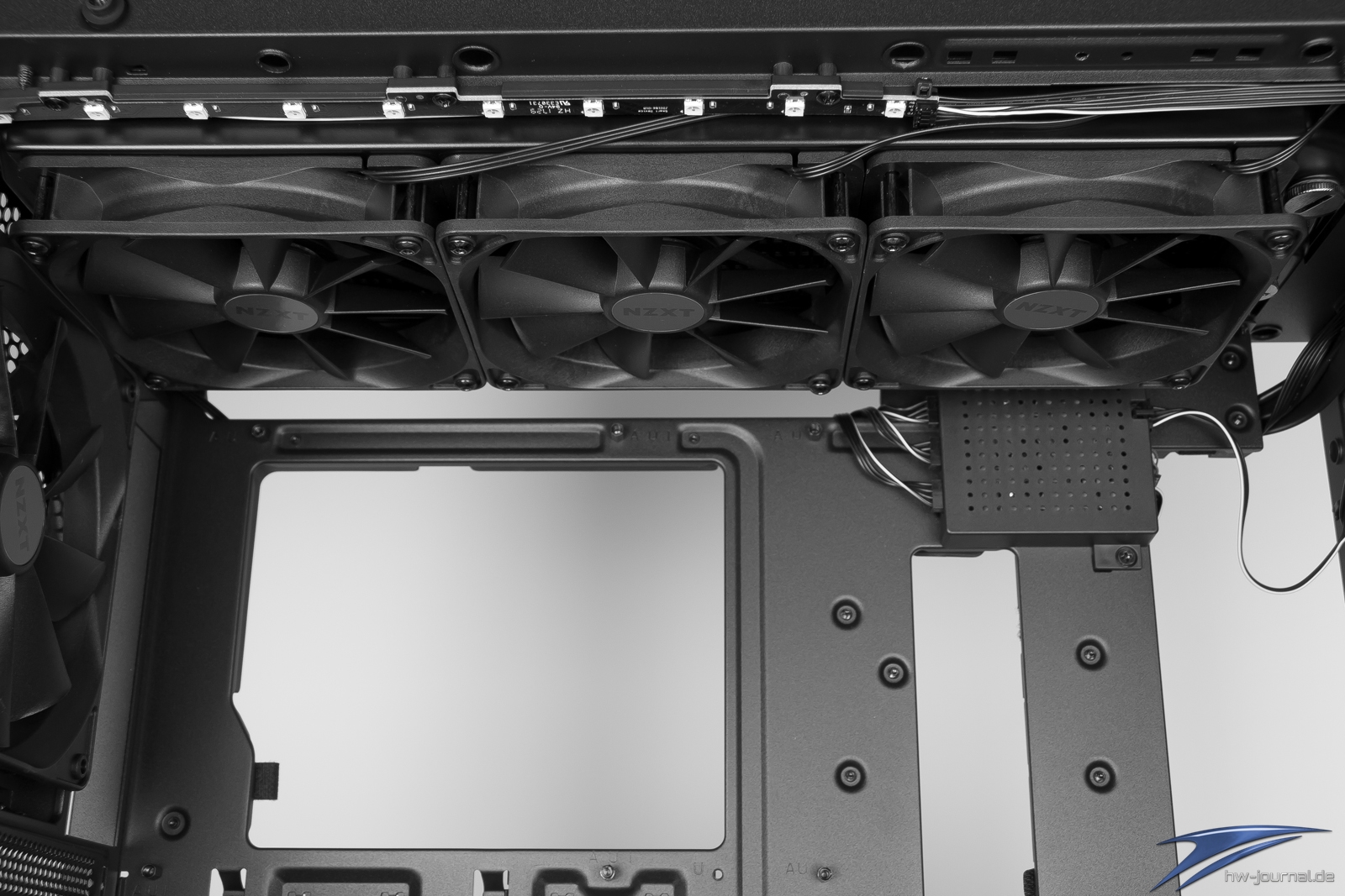 Im Top sieht es schon ganz anders aus, hier muss man sich mit einem mittel-dicken Radiator schon etwas Platz erkämpfen. Für die Installation wird ein Bracket verwendet, was den Vorgang um ein vielfaches erleichetert. Auch andere Hersteller wie CoolerMaster und Thermaltake verwenden ähnliche Lösungen, um große Radiatoren bequem einsetzen zu können.