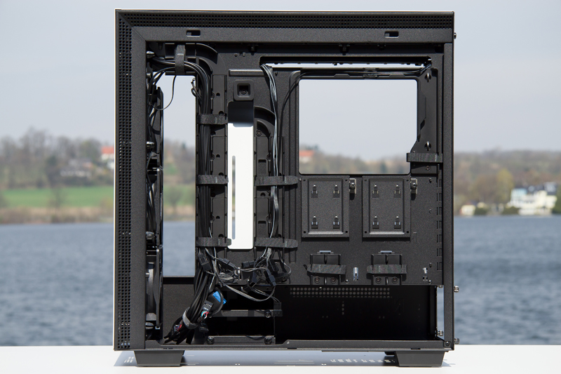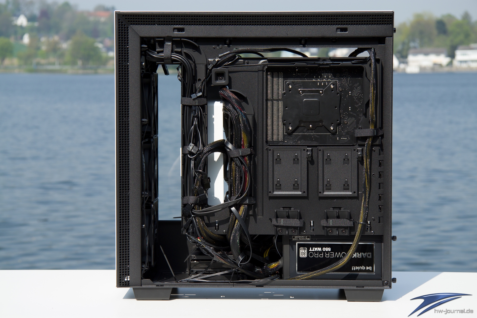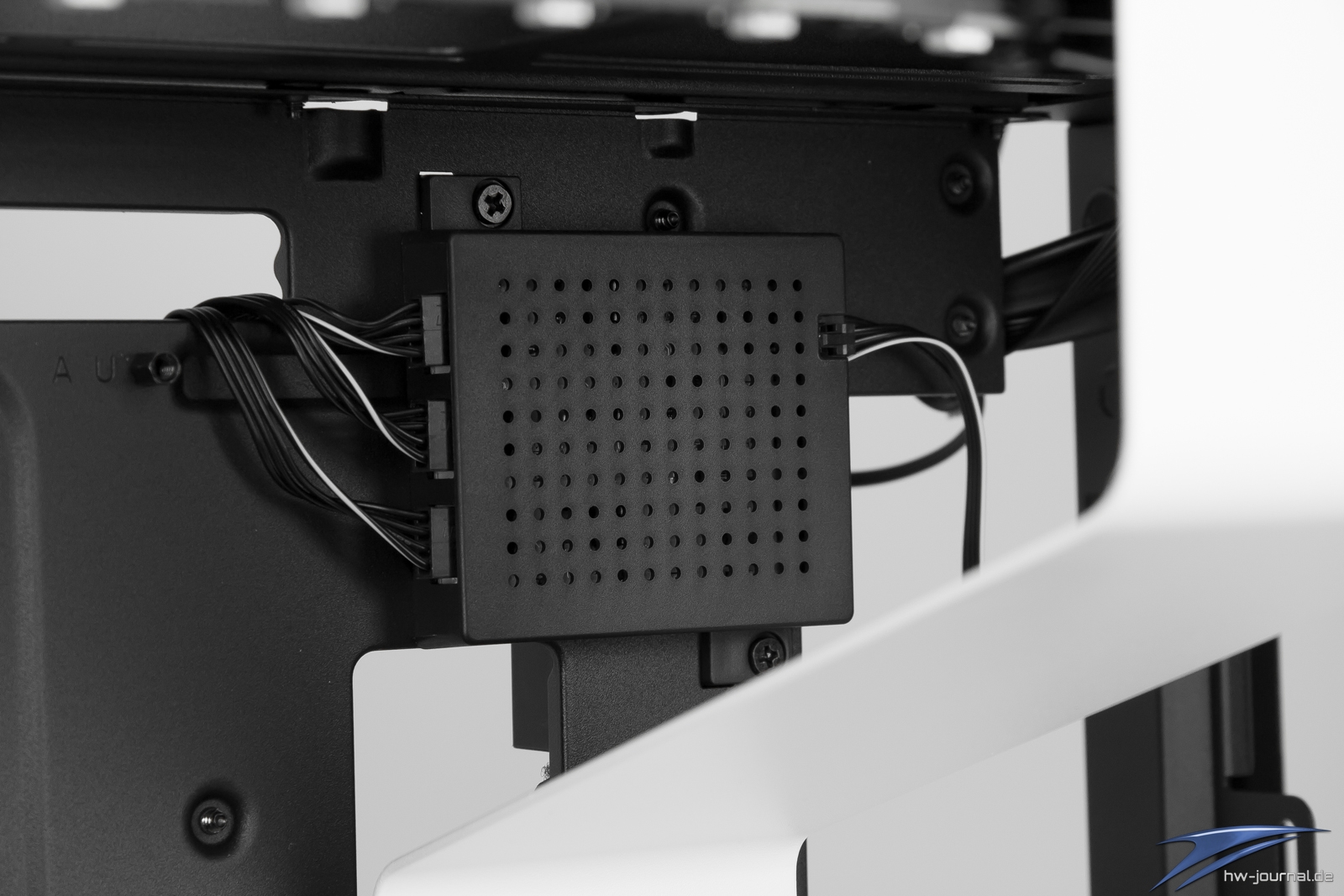 Im Inneren sind dank der weißen Abdeckung nur wenige Kabel zu sehen. Interessanter ist hingegen ein Blick auf die Rückseite, der für den Kabel-freien Innenraum sorgt.