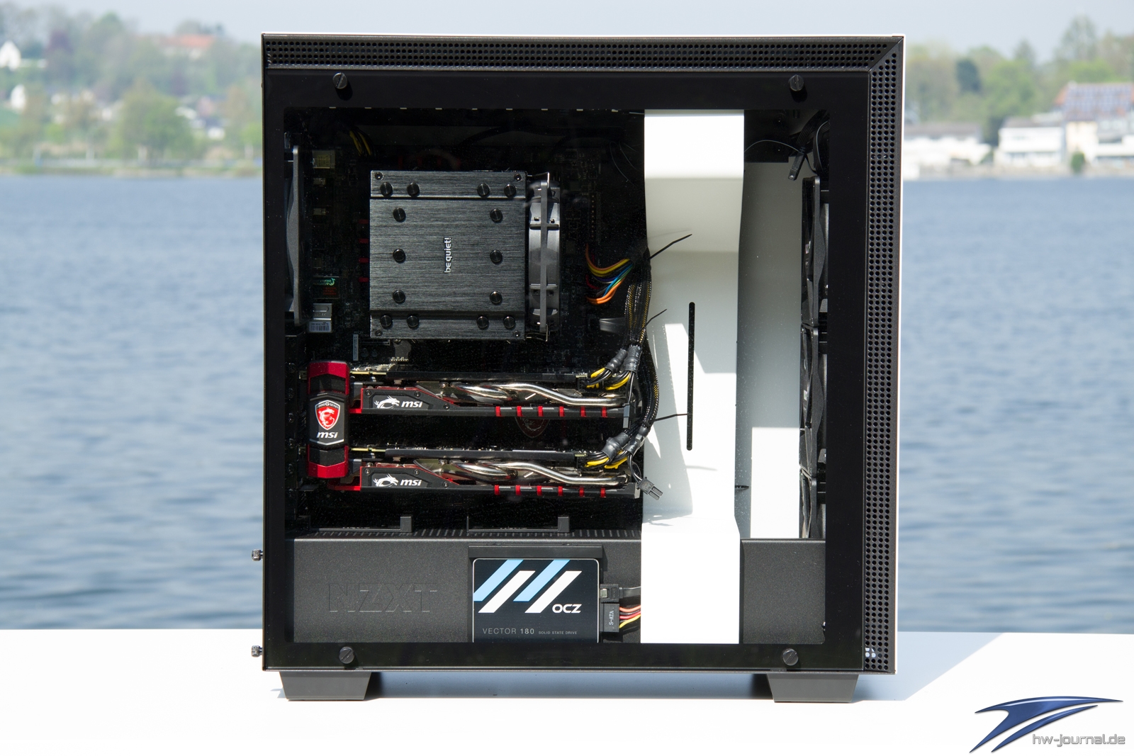 Mit dem Hardware-Einbau muss der Midi-Tower beweisen, dass er auch größere, mit vollem Formfaktor auftrende Hardware aufnehmen kann. In der Regel gibt es bei der Installation von Hardware weniger Komplikationen, ebenso beim NZXT H700i. Der Einbau verlief reibungslos und das Kabel-Management hat dabei eine große Abhilfe geschaffen.