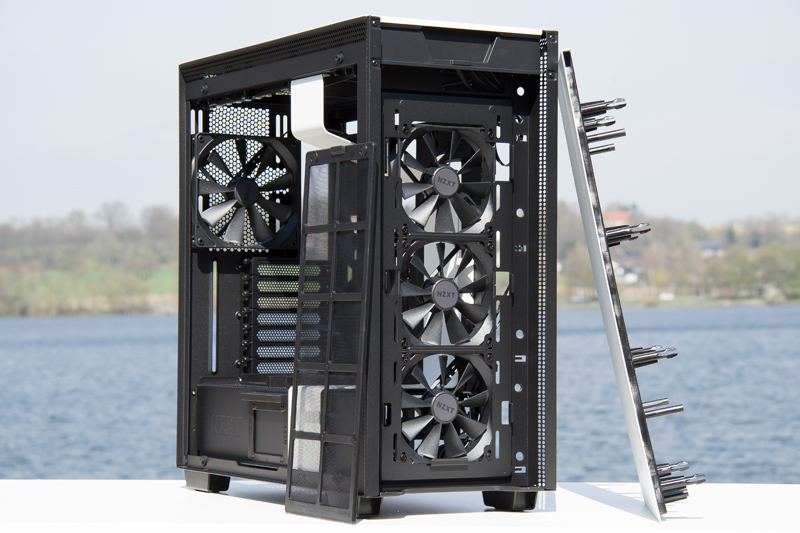 NZXT behält sich auch bei den neuen H-Modellen vor, Front und Top geschlossen zu halten. Entsprechende Lufteinlässe finden sich seitlich als Gitter eingebracht. Das Tempered-Glass-Element ist nicht getönt und wird von vier Rändelschrauben auf Position gehalten. Ungewöhnlich ist die weiße Abdeckung im Inneren des Gehäusen nicht mehr, denn auch andere Gehäuse des Herstellers besitzen diese.