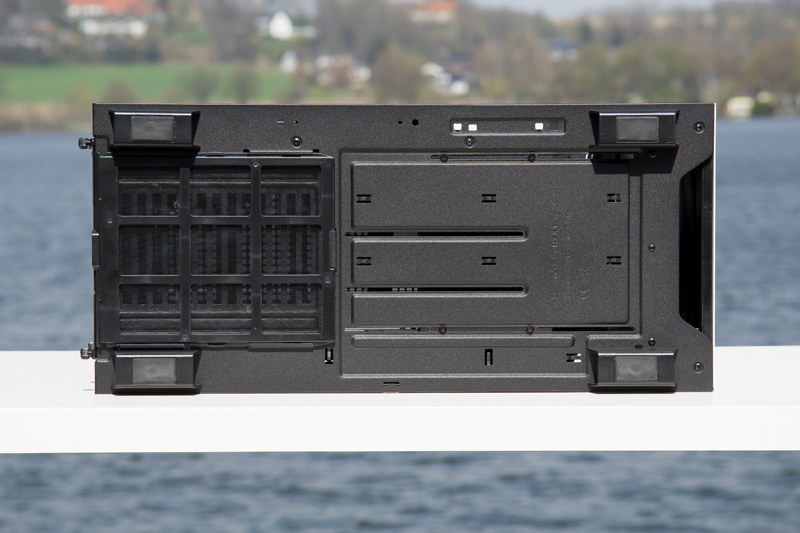Die Unterseite hält einen Staubfilter für das Netzteil bereit, die vier Standfüße sind weit außen am Boden positioniert. Mittig sind drei Schienen zu sehen, die zur Befestigung von Wasserkühlungs-Zubehör dienen. Die Einbuchtung zur Front hin soll beim Lösen dieser helfen.