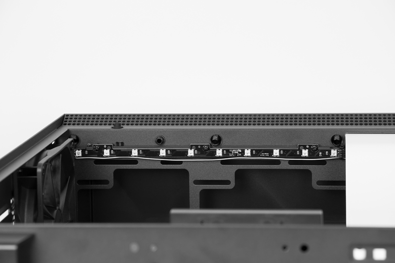 Ein genauerer Blick auf die Netzteil-Abdeckung zeigt, dass dieses ähnlich wie im Top und Front mit Löchern versehen ist. Darauf sind noch einmal zwei 2,5" Laufwerks-Halterungen montiert, sodass wir bereits drei Halterungen zählen. Ein besonderes Highlight stellt die RGB-LED-Leiste im Deckel dar, die eine nette Beleuchtung im Gehäuse erzeugen soll. Durch die weitere, im Zubehör enthaltene RGB-Leiste können besondere Abschnitte oder Bauteile entsprechend in Szene gesetzt werden.