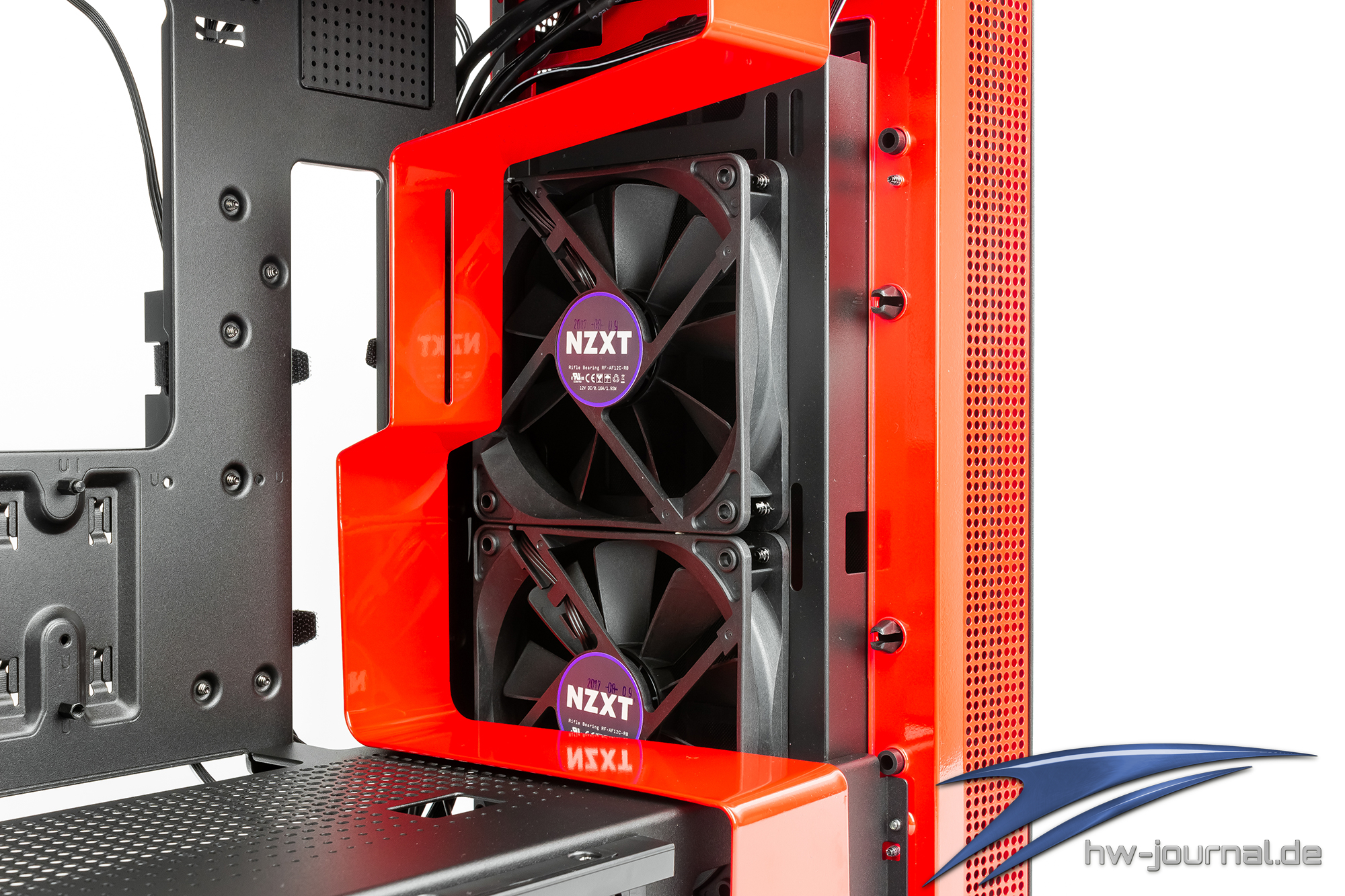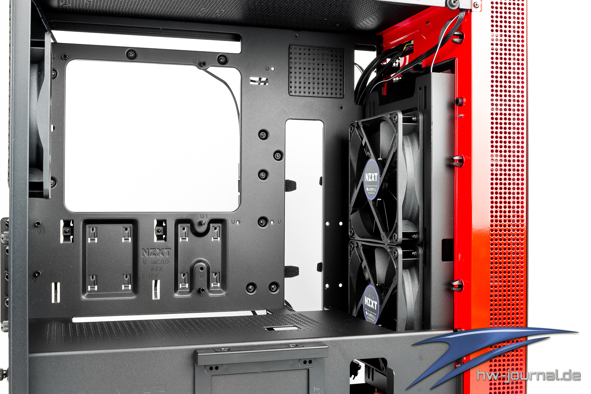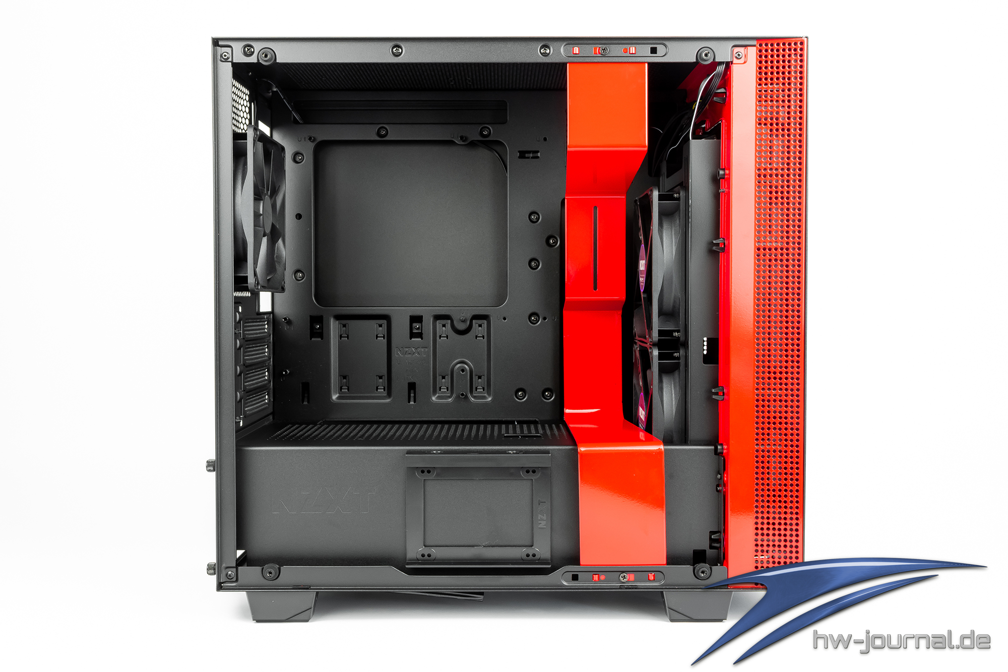 Der Innenraum des H400i lässt sich in drei Bereiche einteilen. Im rechten Bereich befinden sich die beiden ab Werk verbauten 120mm Lüfter, wobei einer der beiden Lüfter zum Teil in der Netzteilblende verschwindet. Links der Lüfter befindet sich die farblich passende Abdeckung die auch hier wieder als Reservoir Halterung einen zweiten Job erfüllt.