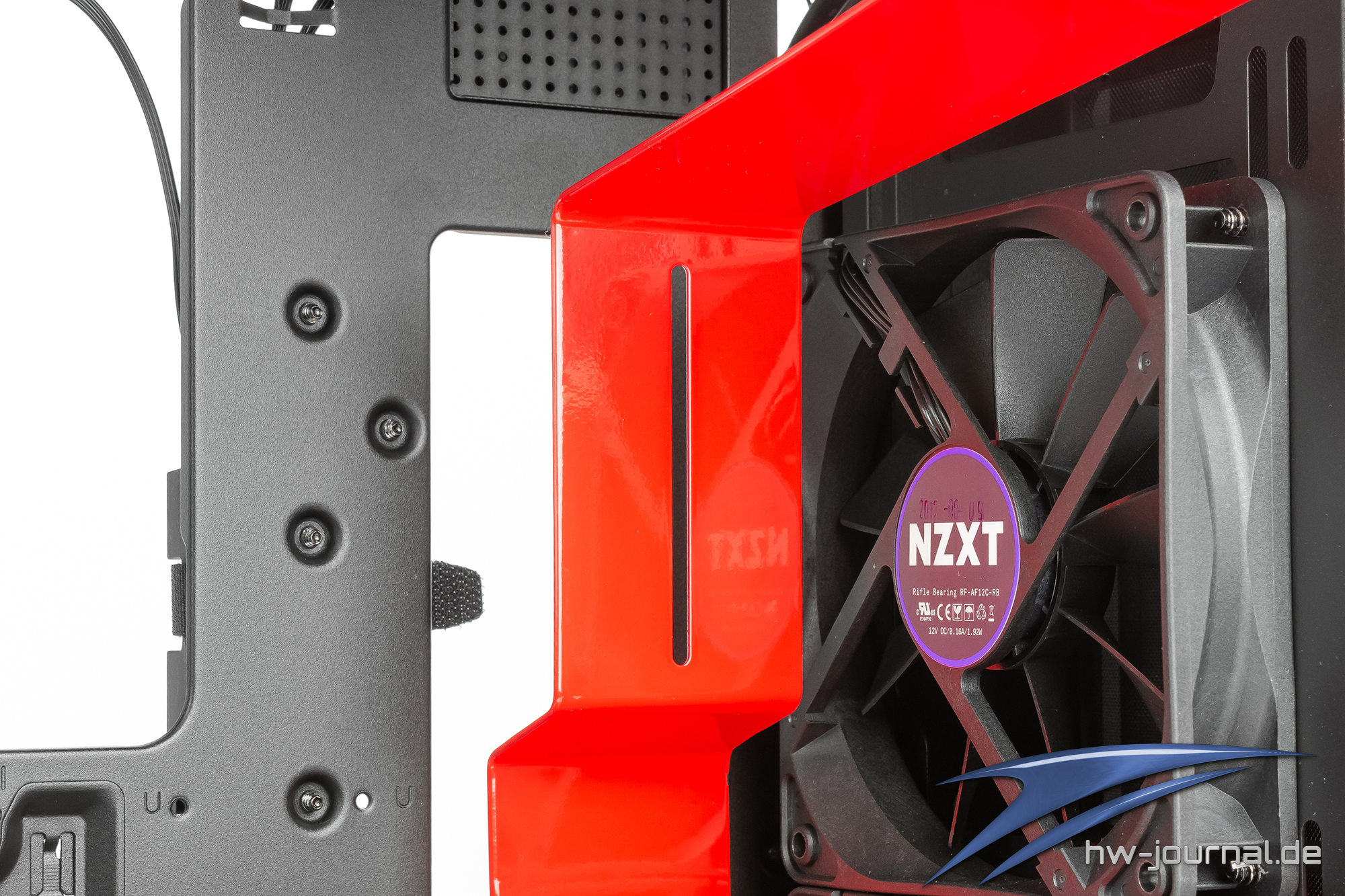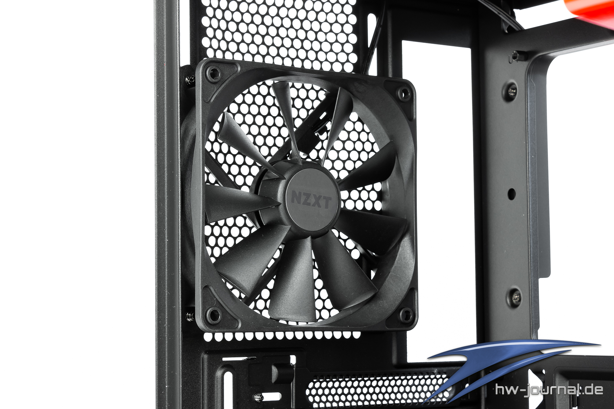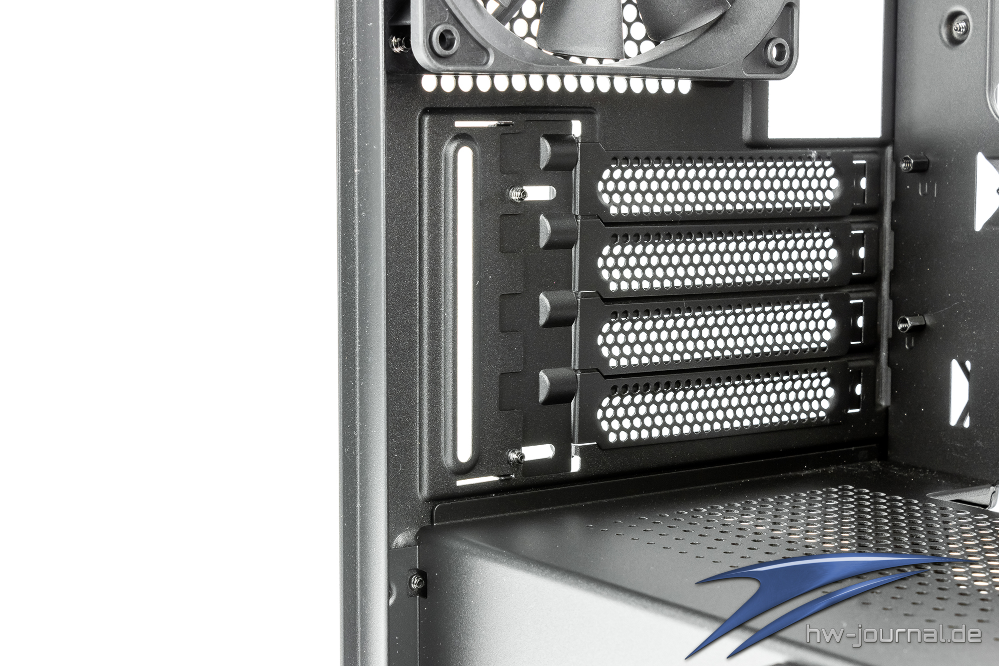 Im linken bzw. hinteren Bereich des Innenraums, befindet sich der ab Werk verbaute 120mm Lüfter. Wie bereits bei der Rückseite angesprochen, befindet sich der Lüfter auf einer Art Schienen wodurch er durch lösen der Schrauben, in der Höhe verstellt werden kann. Unter dem Lüfter, neben den PCIe Slotblenden, befindet sich ein zweiter Haltepunkt für ein Ausgleichsbehälter. Gleichzeitig dient es als Sicherung für die PCIe Slotblenden. Wer dort ein Reservoir befestigen möchte, sollte ich daher im Klaren sein, dass er diesen entfernen muss um Erweiterungskarten ein- oder ausbauen zu können.