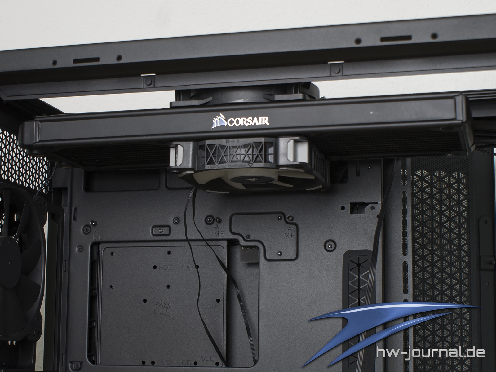 Auch in der Hauptkammer zeigt sich das System sehr aufgeräumt. Die Kabelblende auf der rechten Seite leistet einen hohen Anteil dazu bei. Eine ähnliche Blende wäre unten evtl. auch noch eine coole Idee gewesen, aber eigentlich braucht es keine Kritik. Die Scheibe im Tunnel scheint ein wenig auf Nezteile aus eigenem Hause ausgelegt zu sein. Denn z. B. bei Netzteilen der HX-Serie würde man hier nun groß den Schriftzug, statt des Datenblattes sehen. Oben sieht man schon hier, dass massig Platz für Wasser