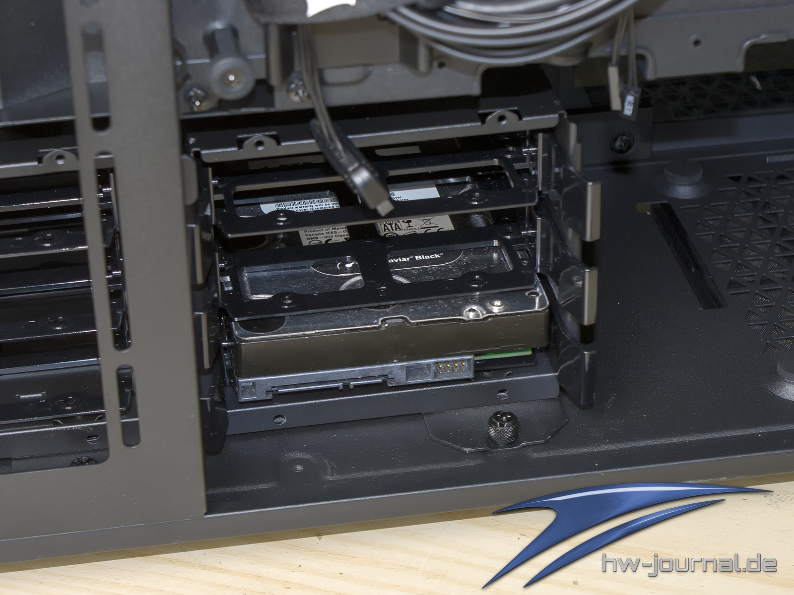 Die Laufwerks-Schubladen nehmen Festplatten ohne Werkzeug auf, bei kleineren 2,5" Laufwerken kommen Schrauben zum Einsatz. Eingeschoben macht sich positiv bemerkbar, dass sie recht weit innen sitzen. Das ist beim Verkabeln ein Vorteil, da in dieser Gegend auch der Hauptstrang entlangläuft. Um SSDs verbauen zu können, müssen immer Schrauben eingesetzt werden, von denen aber nur acht beiliegen. Hier dürfte der Hersteller etwas spendabler sein.