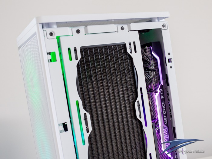 Gerade im oberen Bereich wo sich der RGB-Hub und der PWM-Verteiler befinden, ist quasi unmöglich heranzukommen, so bald eine große Grafikkarte verbaut wurde. Wie gesagt, kein großer Nachteil, man muss die Umsetzung lediglich sehr gut im Vorfeld planen. Die Grafikkarte wird ganz normal in den PCI-Express-Slot eingesteckt und benötigt keine Riser-Karte, was zugleich einen weiteren Vorteil darstellt. Des Weiteren liegen die Lüfter bzw. Kühler direkt an der Gehäusewand an, sodass hier ein direkter Zufluss mit Frischluft existiert.