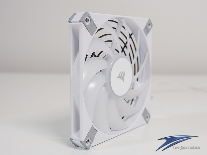 Die Lüfter selbst kommen bei der 120mm-Ausführung mit einem Regelbereich von 600 bis 2000 Umdrehungen pro Minute daher, ein leiser Betrieb erscheint also ohne weiteres möglich. Die Lautstärke gibt Corsair mit 27,5 dbA an, bei welcher Drehzahl wird nicht mitgeteilt. Der Luftdurchsatz wird ebenfalls von 13,4 bis 56,3 m²/H angegeben. Insgesamt haben die Lüfter 11 Rotorblätter verbaut bekommen, sowie ab Werk ein Lüftergitter anno 2008 spendiert bekommen. Diese sehen zwar etwas deplatziert aus, erfüllen aber ihren Zweck. Eine Lackierung in Weiß wäre noch schön gewesen und hätte den roten Faden des cleanen Looks zu Ende gespannt.