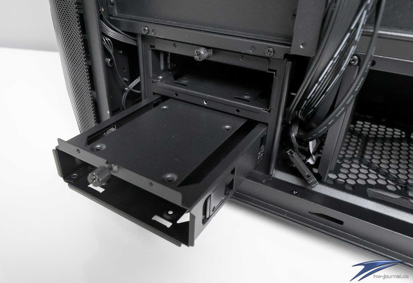 Der Einbau der Laufwerke erfolgt beim be quiet! Dark Base Pro 901 entweder direkt im Gehäuse, oder man entfernt den Unterbau. Dieser kann auch als Mainboard-Schlitten verwendet werden, auch sogar direkt als Benchtable – je nachdem wie man es betrachtet. Dieses Feature haben wir einige Jahre nicht mehr gesehen und war in High End Gehäusen vergangener Generationen öfter mal zu sehen gewesen. Sehr löblich. Die damit verbundenen Vorteile bei der Montage dürften sich wohl von selbst ergeben.